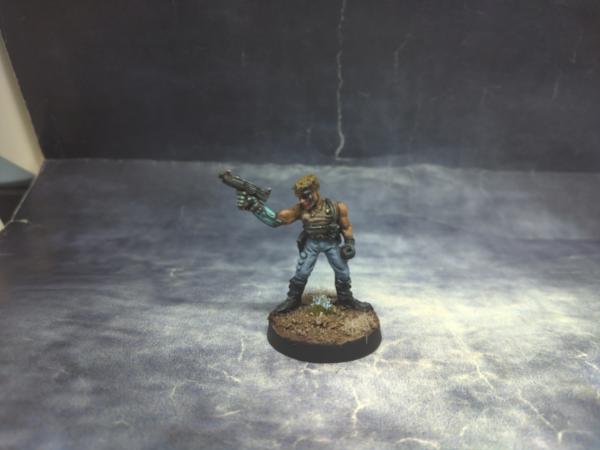 While searching online to try to figure out when this model was released (1988), I came across an example of this guy painted in Flesh Tearers colors, in which the painted remarked on the model's resemblance to "Snake" Plissken. I decided to go in that direction with his colors.