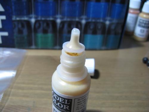 Next up was testing the vallejo model color paints. These have very high pigment content so separate if you leave them for just a day it seems. Shaking them is always a big pain and takes a lot of effort when they have separated to a great degree. The second photo below shows how to open a pot in case you have not seen it before (or have not had the joy of a pressure build up from a blocked nozzle forcing the cap off and ejecting paint all over your new carpet.. oops). As you can see, the diameter of the vallejo pot is about 12mm, so an 8mm lava bead will comfortably fit inside, even if you have a load of dried paint around the cap. When you put the lid back on, be careful of paint shooting out the nozzle from the increasing air pressure as the cap is lowered. You definitely want to wear gloves when doing this to vallejo models, and have a lot of tissue paper handy. The final picture below shows the paint looking very mixed after about 15 seconds of shaking with a bead inside the pot as an agitator.