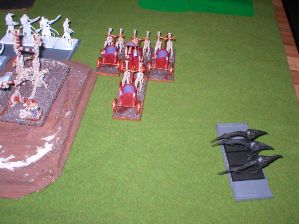 For some reason, I decide to ignore the Slaneeshi things in my rear and moved the chariots and Ushabti up to face off against the Daemons. I tried to bait-and-flank the Daemonettes with my placement. The one surviving Skeleton Horse Archer decided to stand next to the Daemon Prince, just to annoy him.
