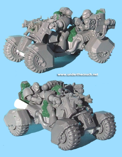 I had built these as attack bike proxies, which is why they have the same weapons configuration as an attack bike. I would think they still look a little too much like bikes to be an acceptable speeder proxy. This, however, could probably work just as well as either an attack bike or as a speeder (with the removal of the bolters, obviously)...