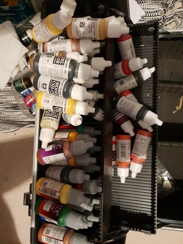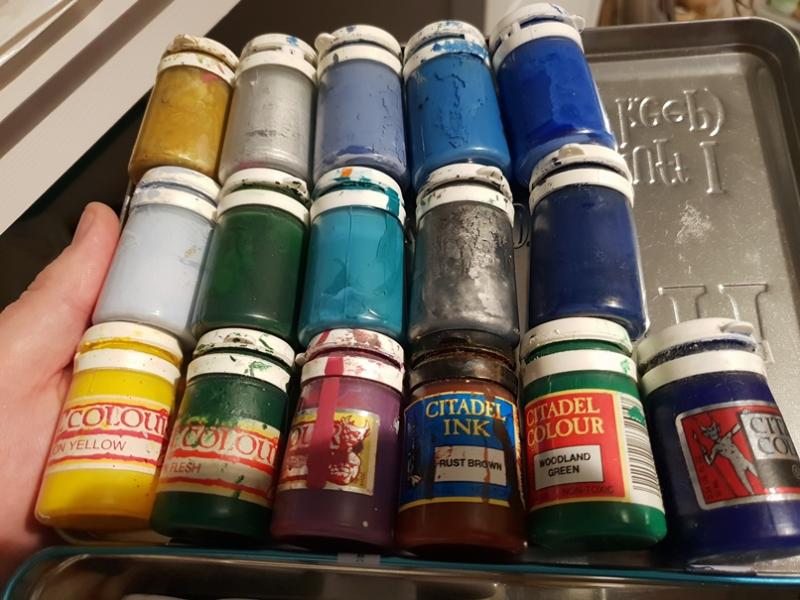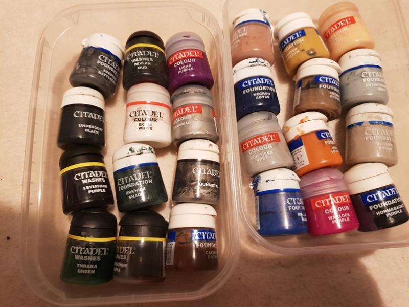 Original Citadel paints Replacement original Citadel paints and a couple of second wave paints 3rd wave Citadel paints 4th wave Citadel paints Some random bits I found Vallejo game and model colours Shades and glazes My modern base paints. I forgot to take a photo of an equal number of layer paints Random Flames of War, Vallejo washes, P3 yellow and some Army Painter grey