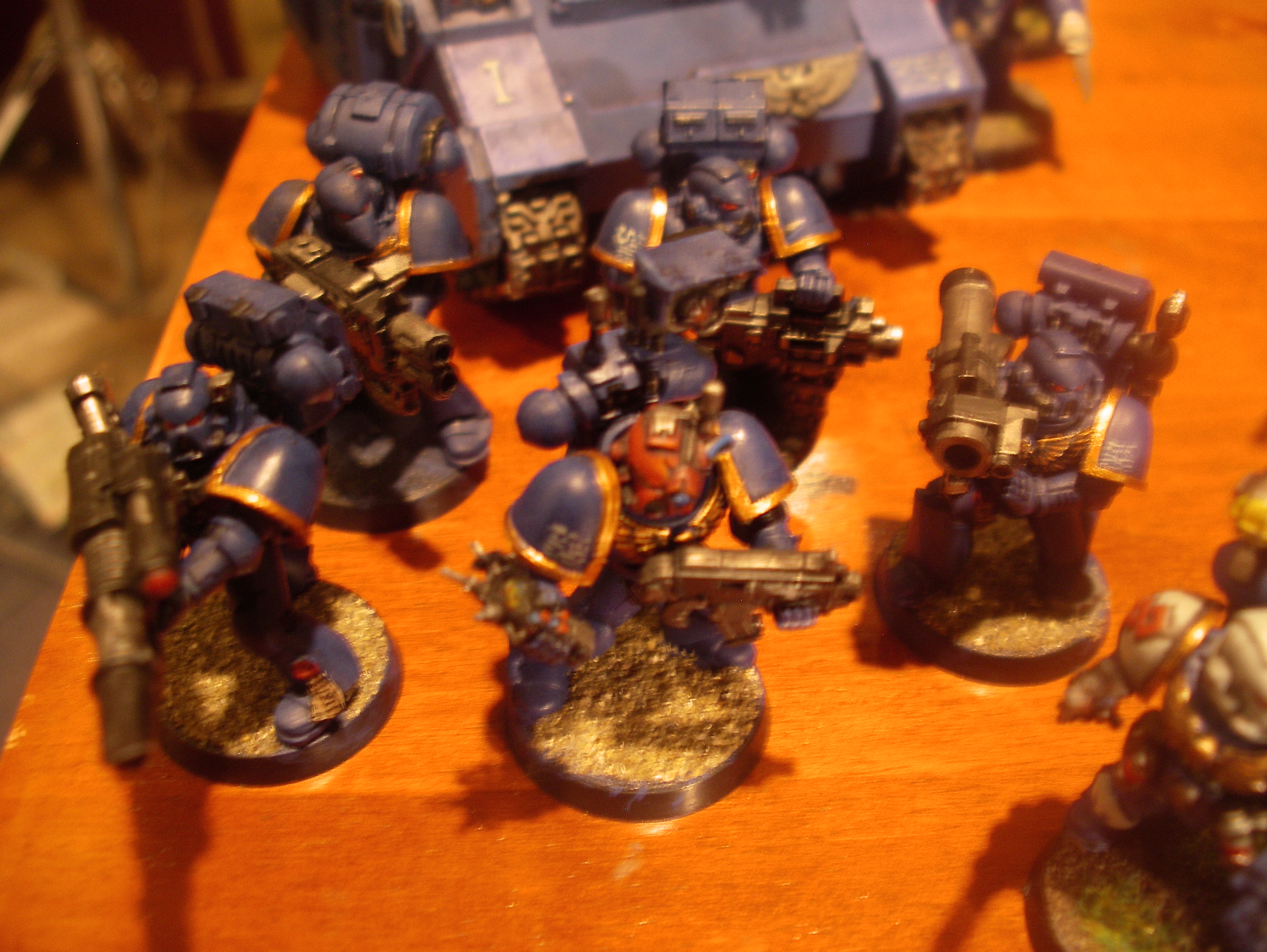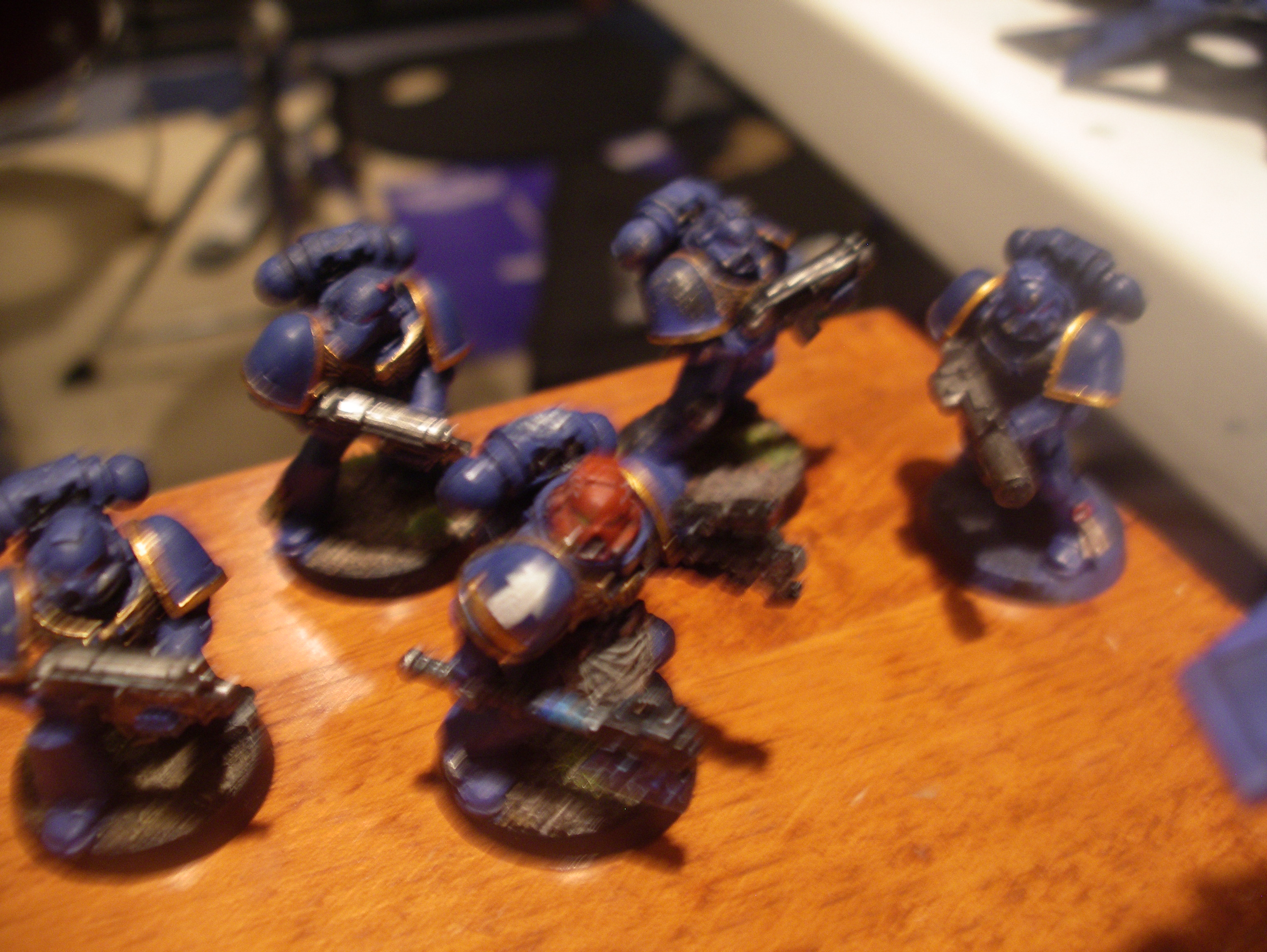 Did more work on the sgts, just need to do gold on the shoulder pads, and their backpacks. This is where I have a problem. I don't like painting gold, the method I use is Scorched Brwon, Dwarf Bronze then Shining Gold. This can be extremely tedious and can take a long time, especially when doing shoulder pads, and it usually ends up coming out uneven and blochy. do you guys have any advice? im not sure what to do about it, I can't water the paint down, it comes out even worse. (and before you ask, i'm rubbish at nmm  )