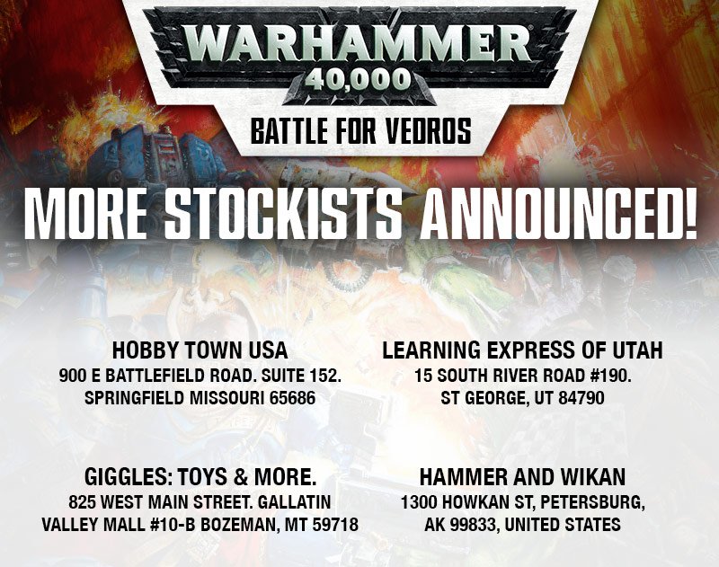 WARHAMMER 40000: Battle for Vedros Will not be available through Games Workshop. Street Date: June 6th!vedros display GAWB4VFSP WARHAMMER 40000: Battle for Vedros Starter Package $635.00 SRP