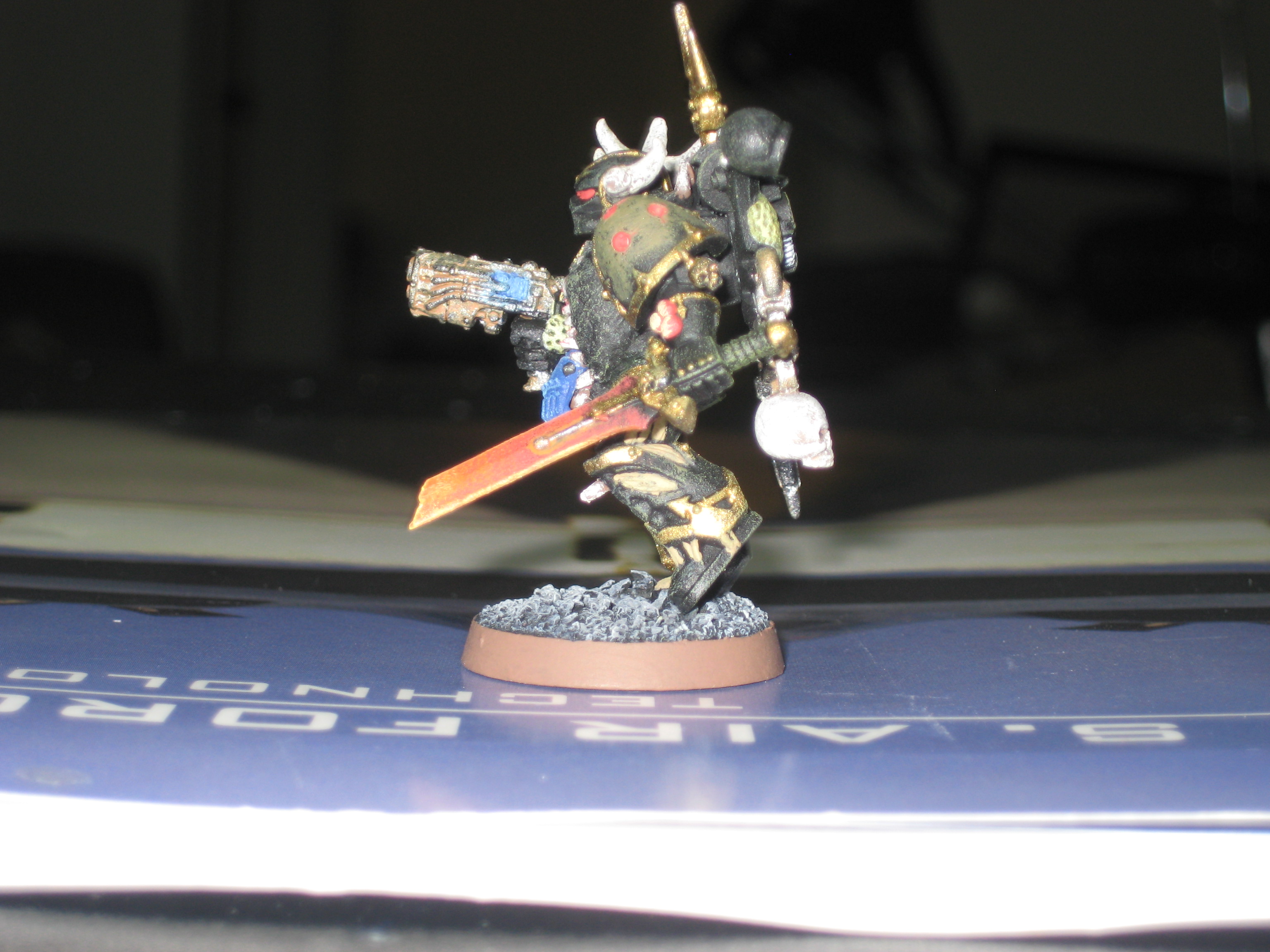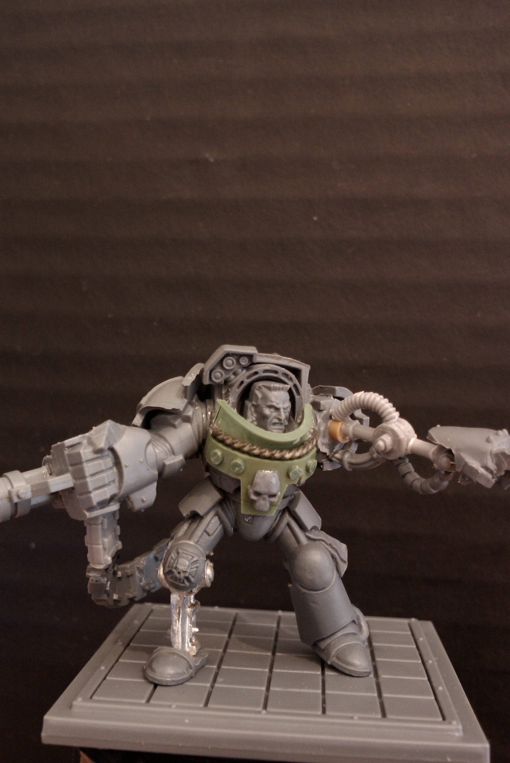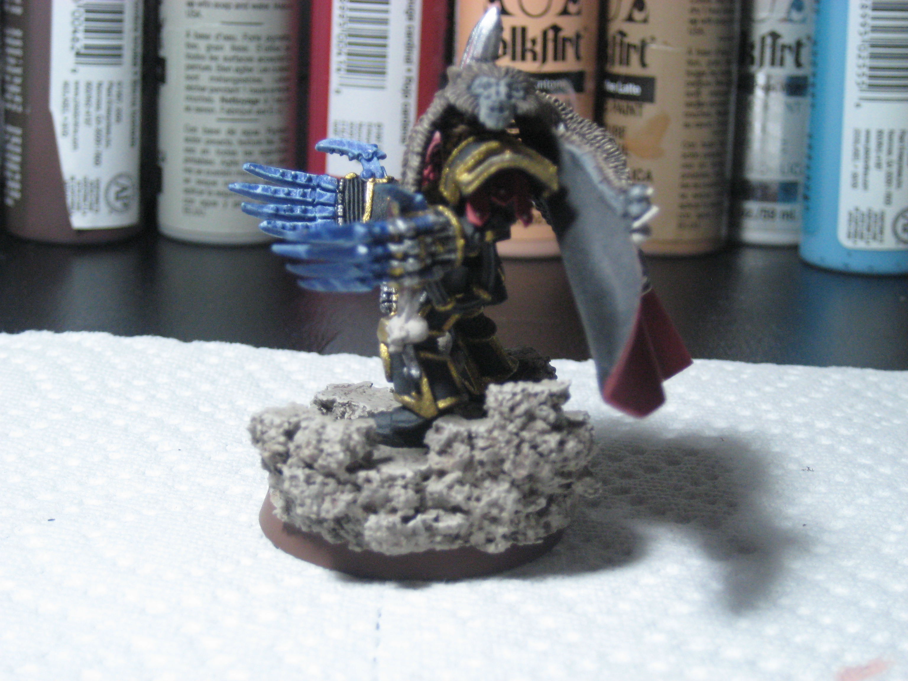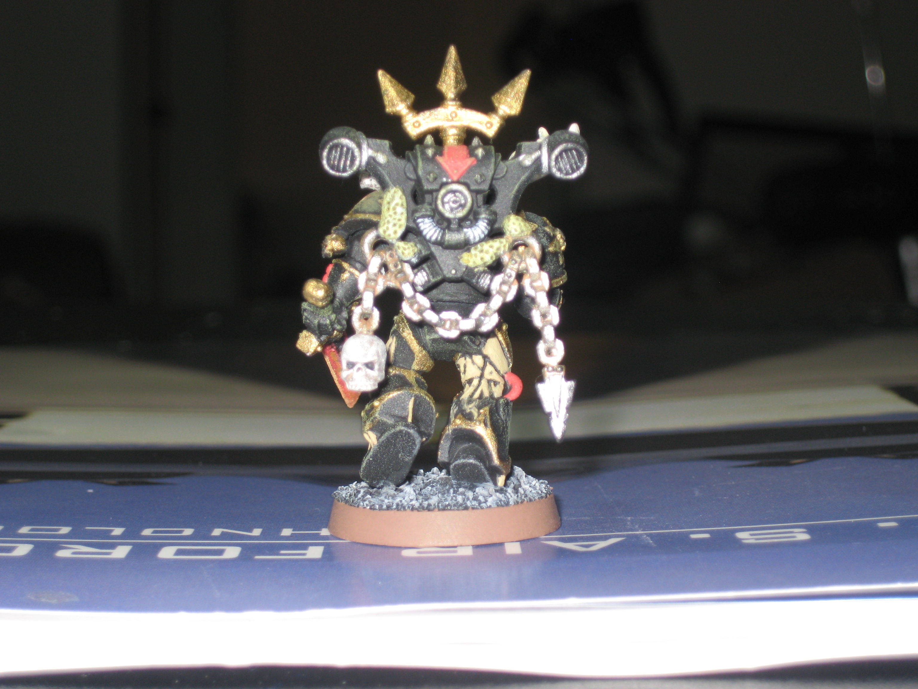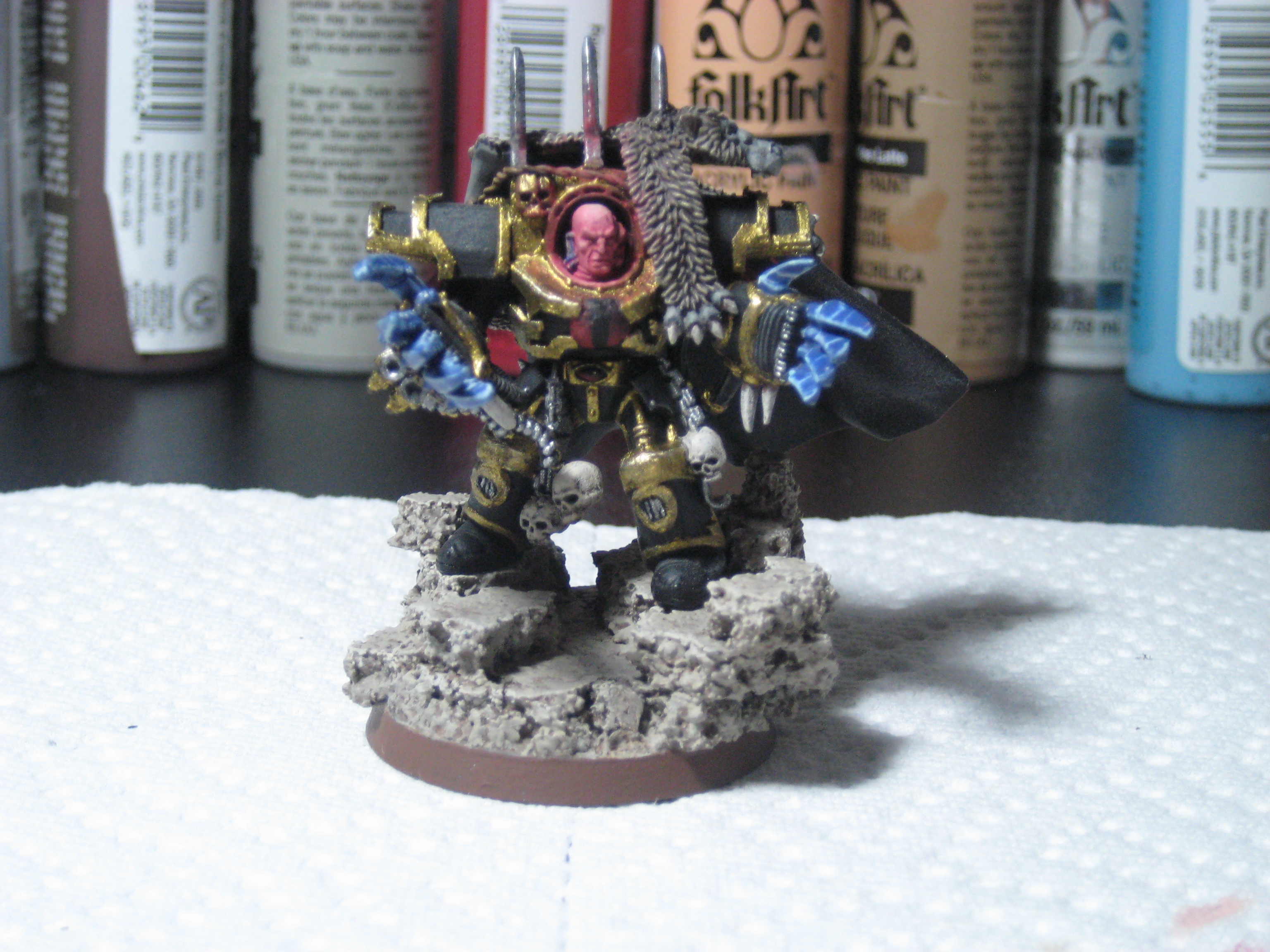 The base is cork, the legs are chaos terminator legs, that I scraped off the knee-pads from, and added custom trim, and extra skulls to. The torso, WAS also a chaos terminator torso, but then I added layers of plasticard, and custom sculpted the front. The shoulder pads are scratch-built, the head is a terminator lord head, and the cape is a space wolves terminator lord cape, that I had to expand to fit my expanded torso.