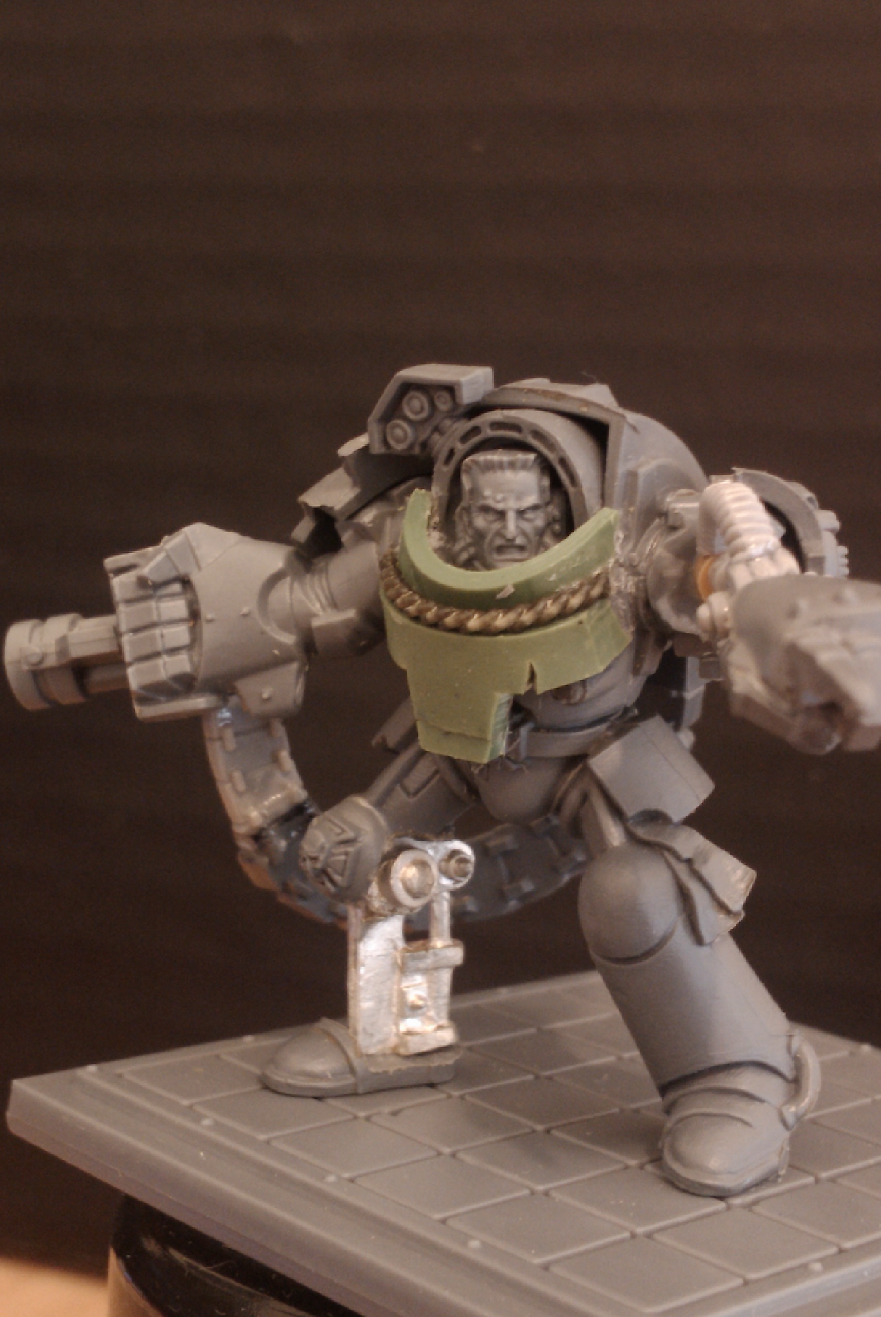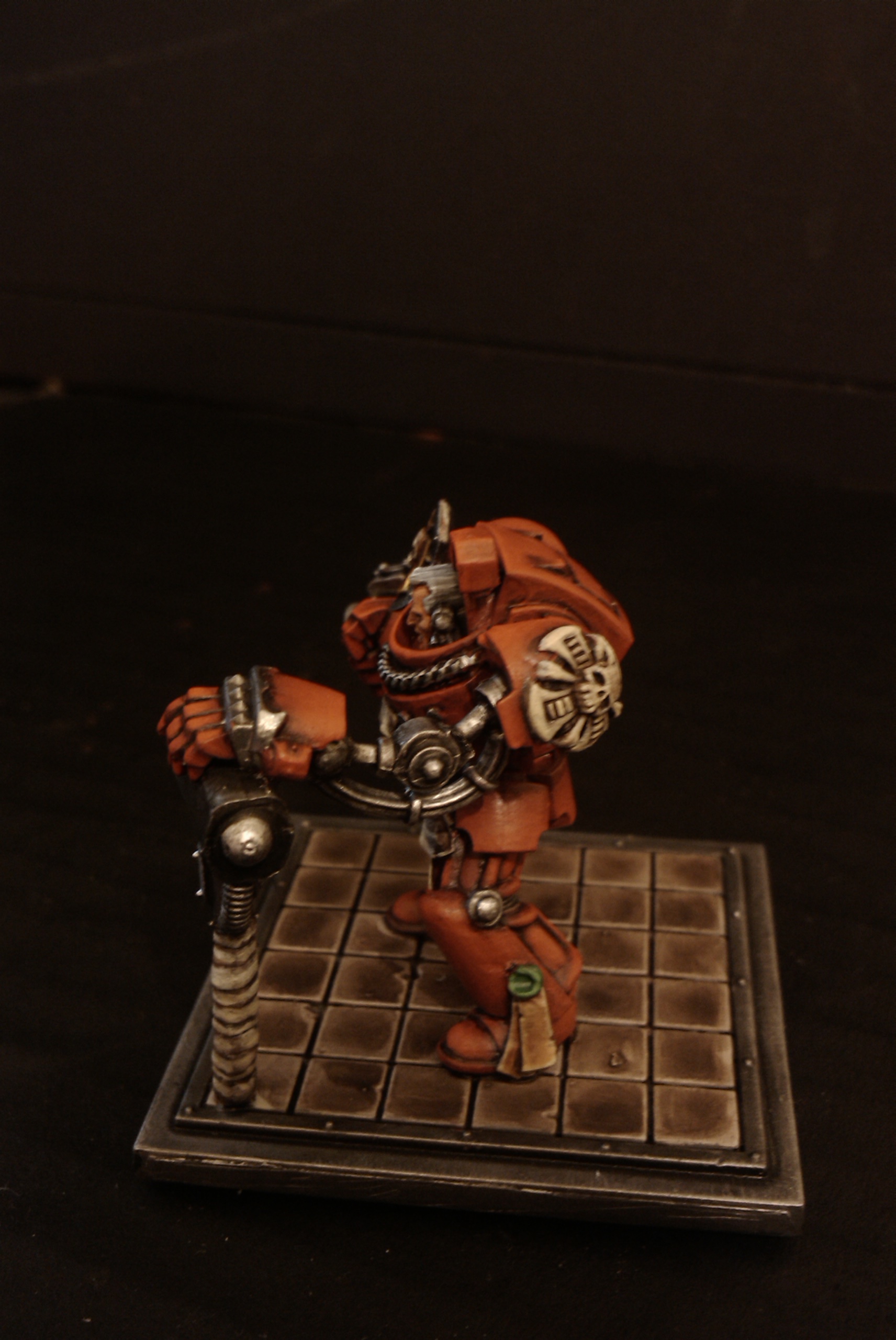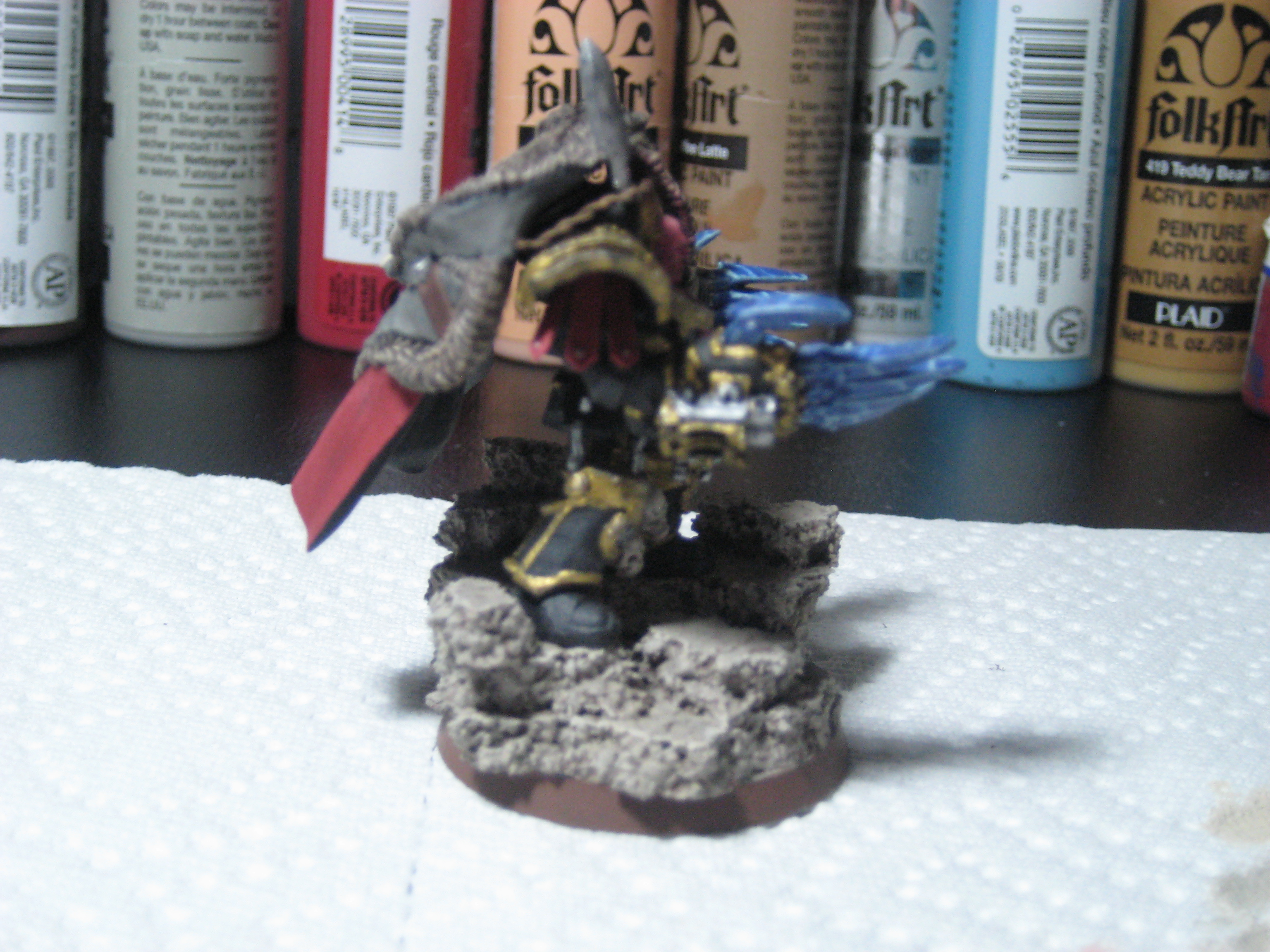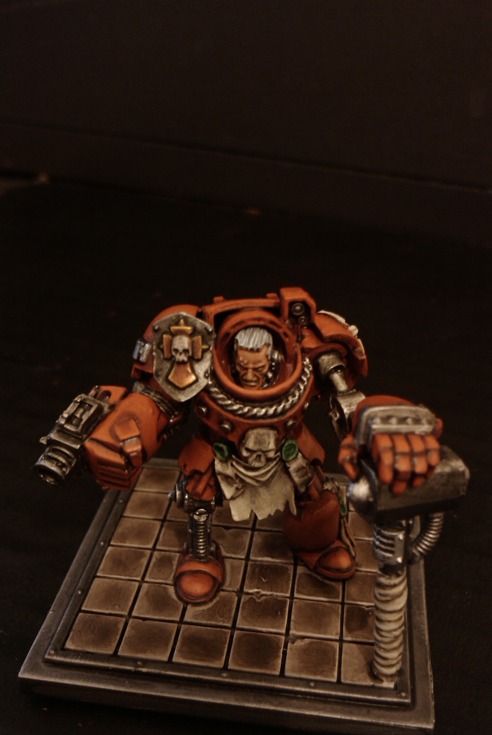 The base is cork, the legs are chaos terminator legs, that I scraped off the knee-pads from, and added custom trim, and extra skulls to. The torso, WAS also a chaos terminator torso, but then I added layers of plasticard, and custom sculpted the front. The shoulder pads are scratch-built, the head is a terminator lord head, and the cape is a space wolves terminator lord cape, that I had to expand to fit my expanded torso.