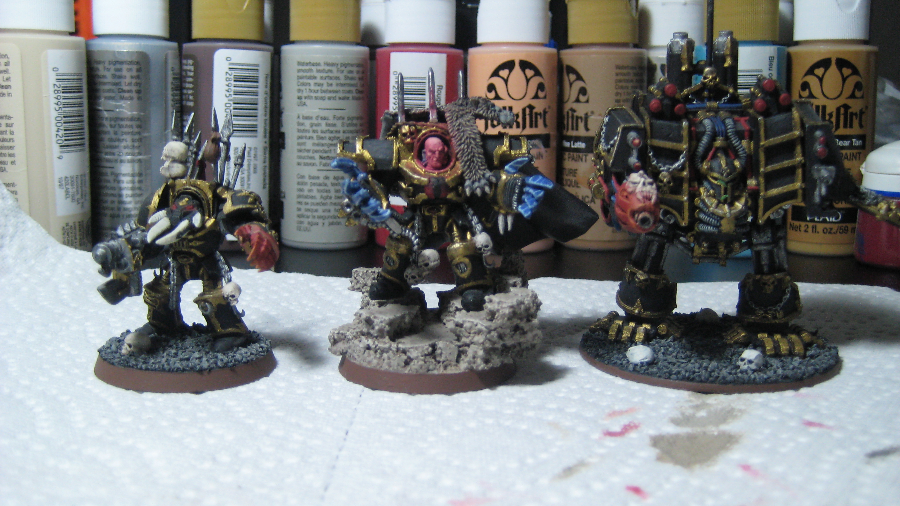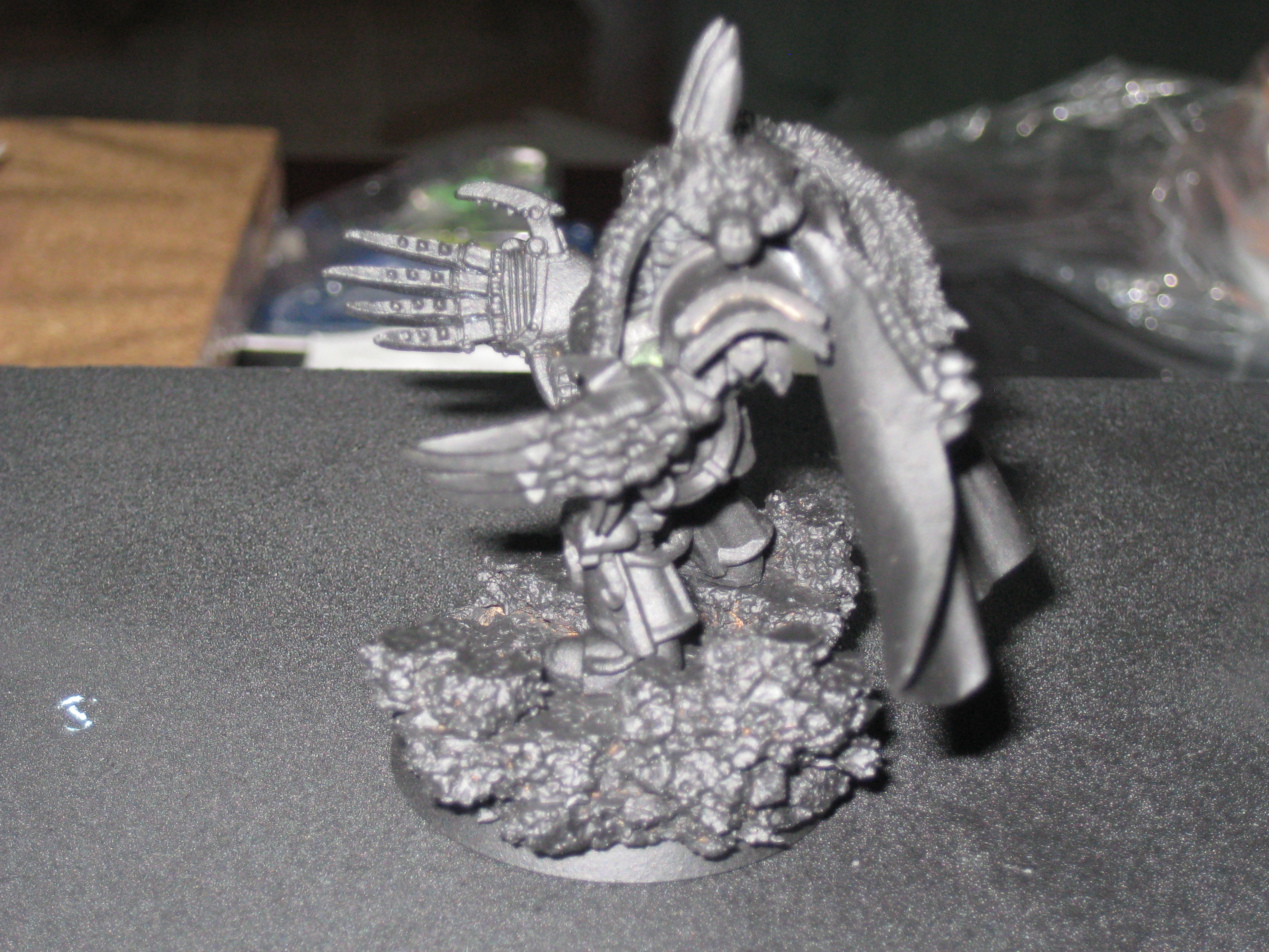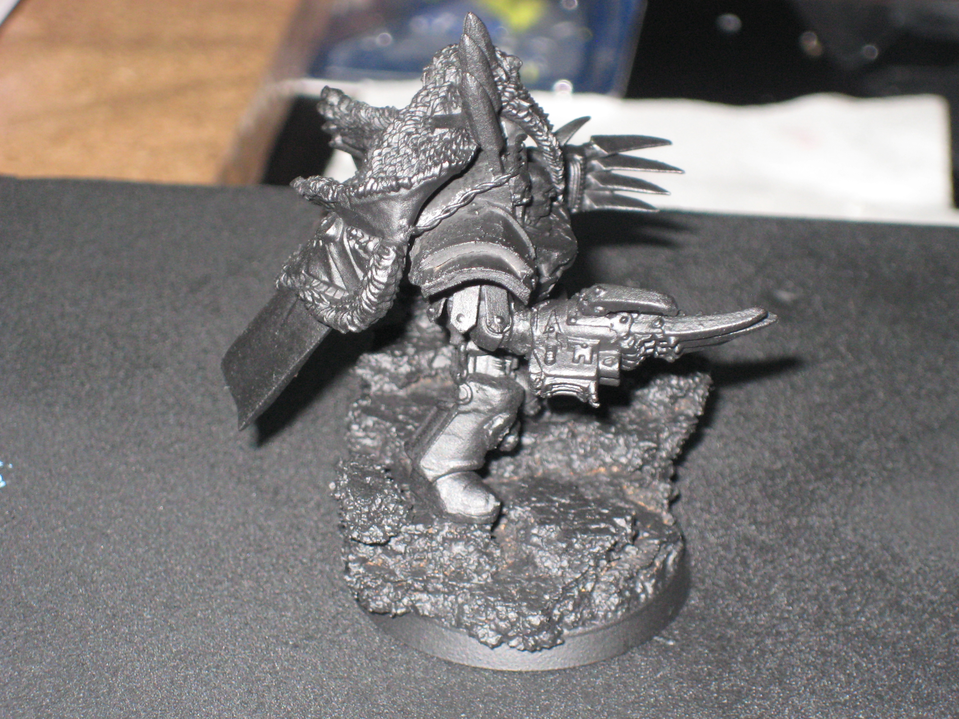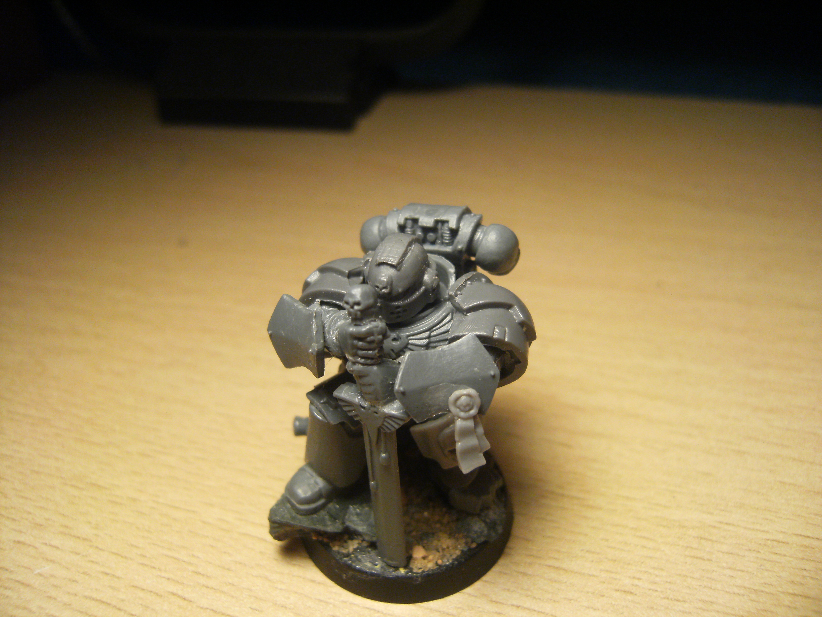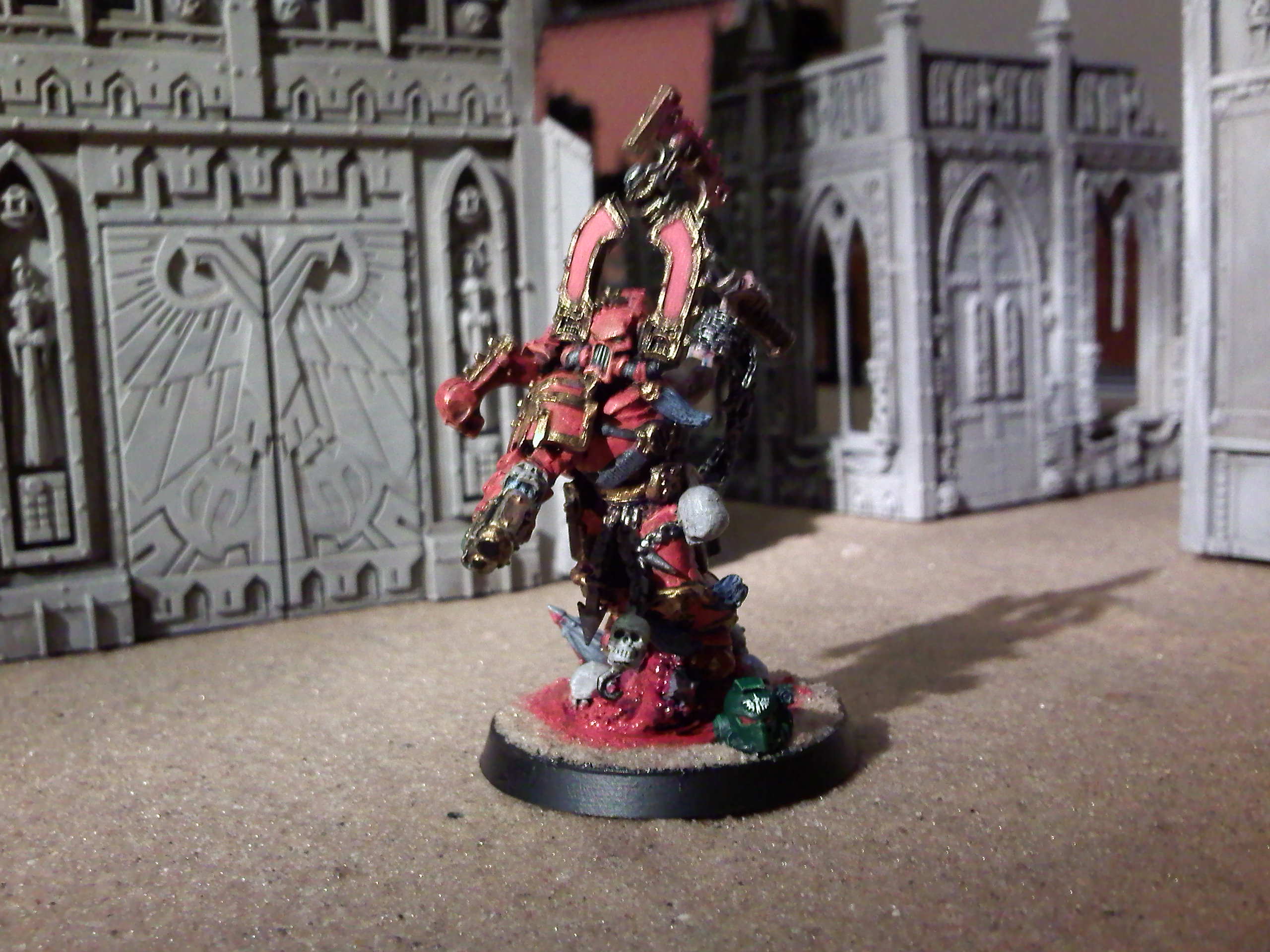 The base is cork, the legs are chaos terminator legs, that I scraped off the knee-pads from, and added custom trim, and extra skulls to. The torso, WAS also a chaos terminator torso, but then I added layers of plasticard, and custom sculpted the front. The shoulder pads are scratch-built, the head is a terminator lord head, and the cape is a space wolves terminator lord cape, that I had to expand to fit my expanded torso.