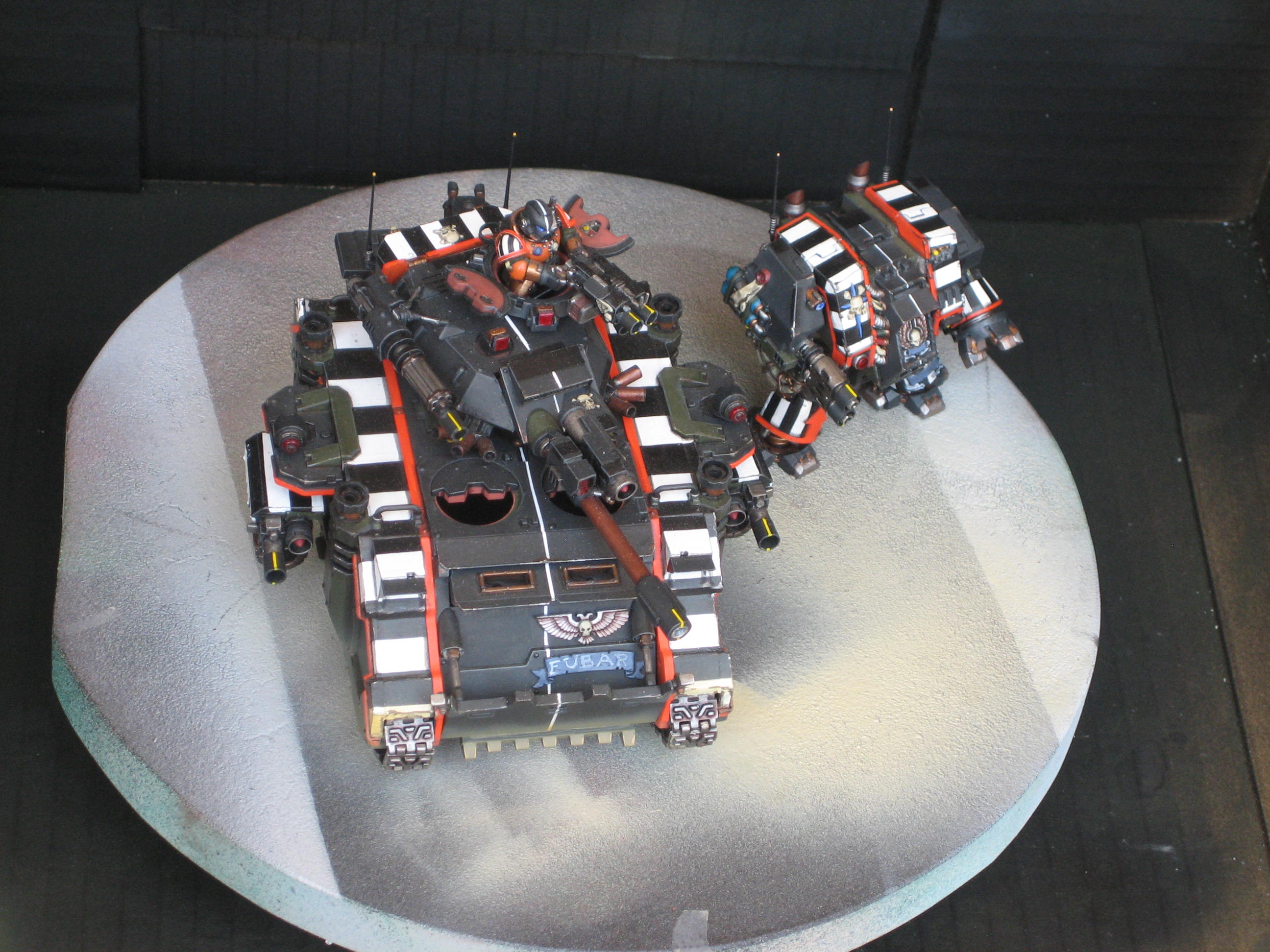 Started with a MK1 Rhino body. Added a MK3 Rhino front plate (shaved down to fit) and GS to fill in the ugly gaps the MK1 has between the hull and tread.