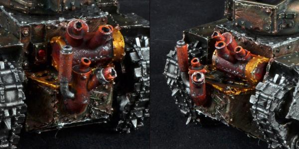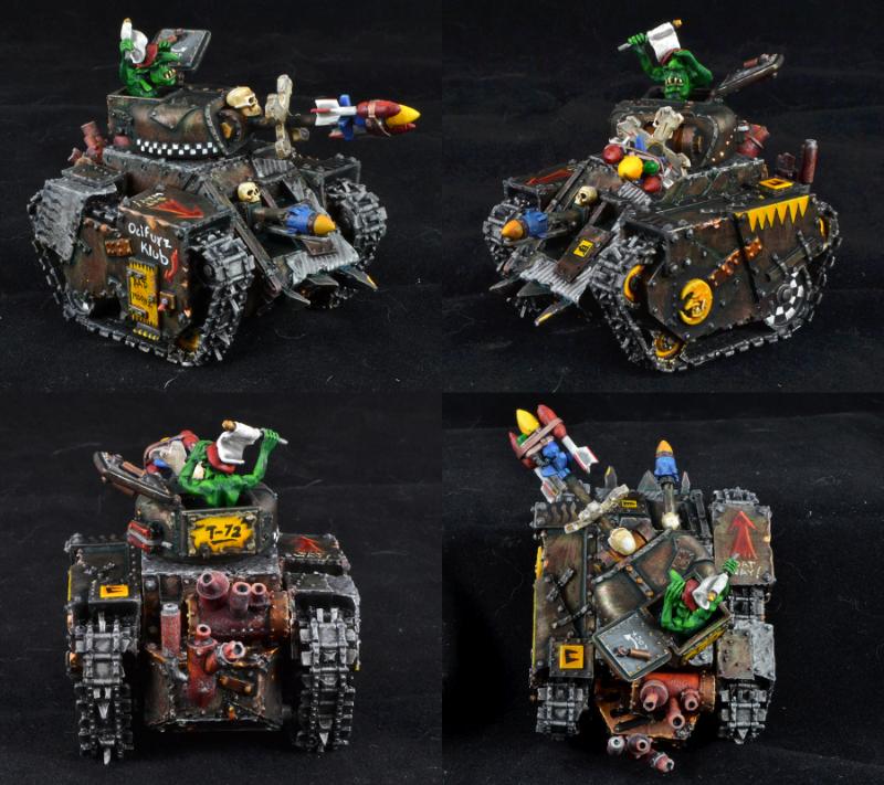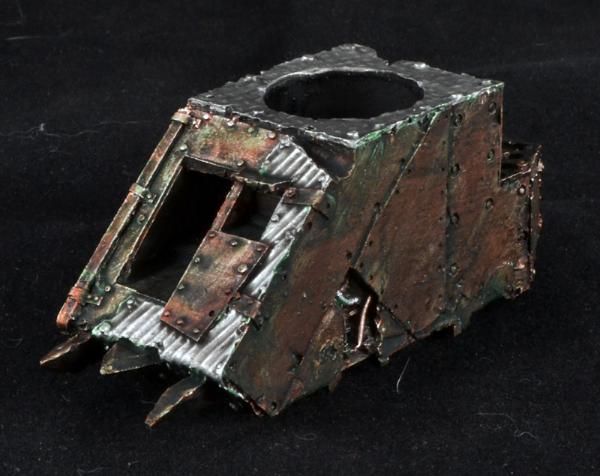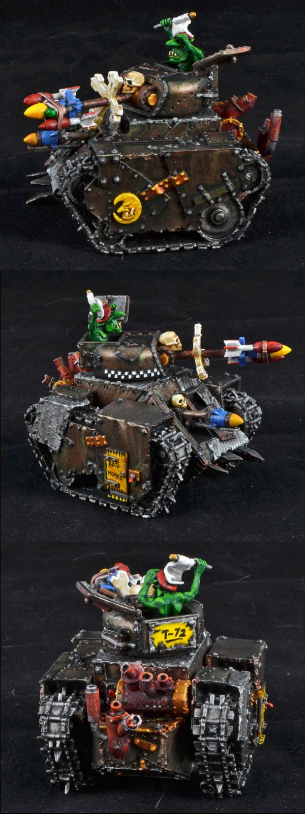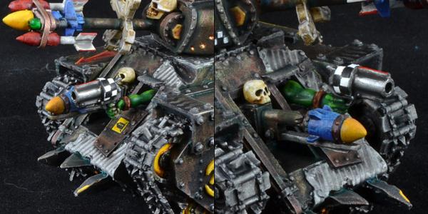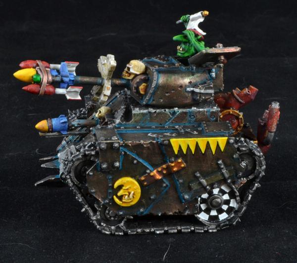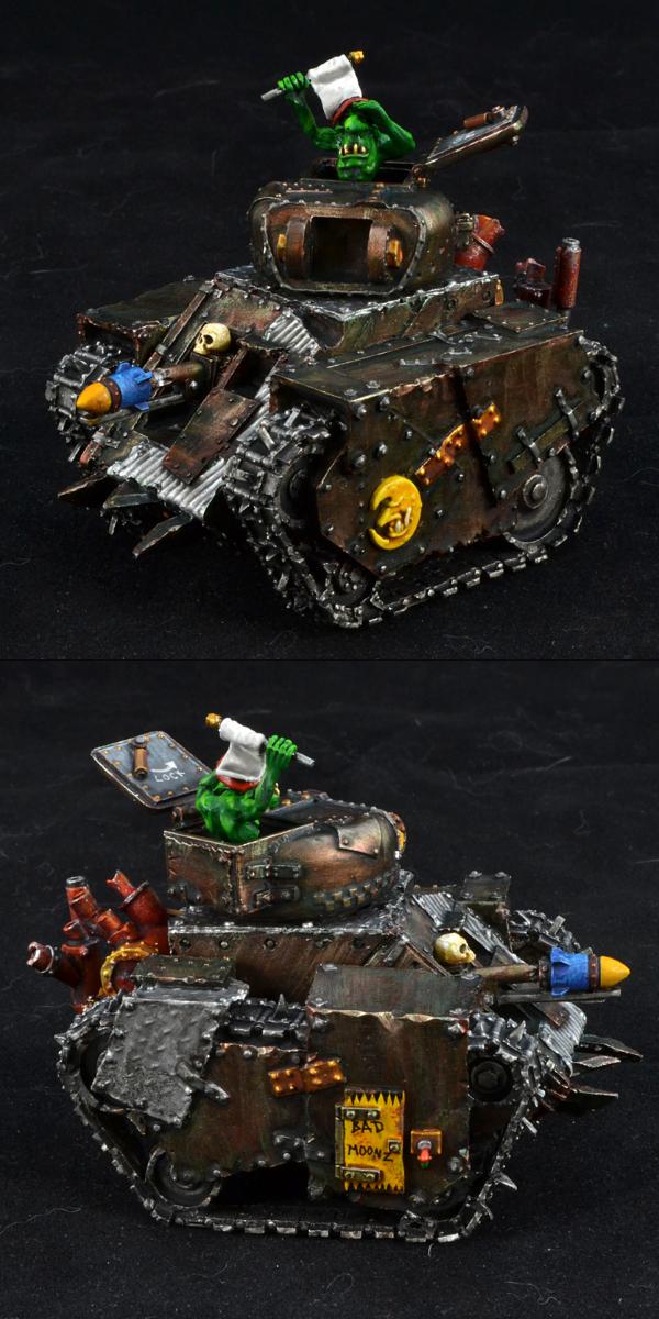 Tank is really starting to come together now. Added a much wider variety of metals across the body, and the exhausts of course which you've seen already. Added a side door with an enticing red switch... A switch to open the door? A doorbell perhaps? Or is it a second self-destruct switch because the grotmek couldn't remember where he put the first one and he was REALLY paranoid? Oh, the lower rokkit launcher (magnetized of course... added a human skull for good measure), a "bad moon" emblem on the other side and began work on the turret. The tank commander's there waving his "banner". What's that you say? He's waving a white flag you say? Is he surrendering you say??