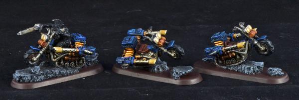 That's just the angle of the shot, the lens is fully painted. I think what remains to be added is some kind of bad moon symbol (if I can find my decals) and a boss pole of some sort. He just doesn't feel right without one. OH, and here's a pic of the first four finished bikes. Again, not too fancy a paint job but I did go over them fairly carefully and added a lot of detail that wasn't originally there, cleaned up some sloppy bits, etc. I even noticed that the bikes have license plates so you know I couldn't resist that... As today is my day off, I'm hoping to get the final two touched up and at least get the main colors on the three new bikes. It's very exciting to think that I'll be "done" with this unit when I finish those last three!