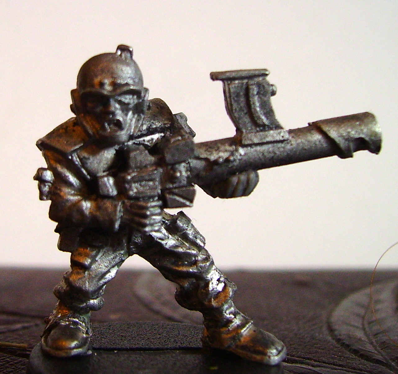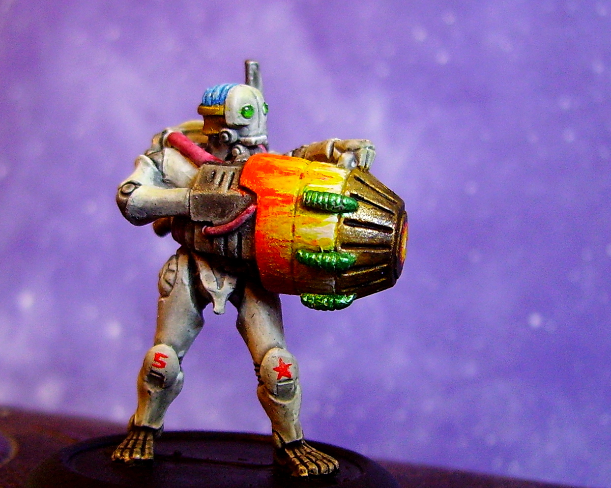 sure^^, what range is he/it from? the really big gun is a nice contrast to the rather pale body...i lkie the eyes of him particulary...the freehand on his kjnees looks as if you actually had a liesized modle and spraygunned the "5" and the star onto it via a stencil...