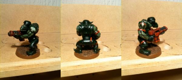 @CommissarKhaine: Thanks! I am pretty pleased with his (and the others - they look better lined up together!) progress. The Twin-Linked Shoota was Morgrim's original - just there for feel - maybe permanent, maybe not. It did make me think whether I should repurpose the left arm for one of those "taktikal" displays - but then I can't have the right arm leaning over activating it anymore... the cc weapon *is* the PK - so other options (pointing, giving the finger etc) are entertain-able at this point
