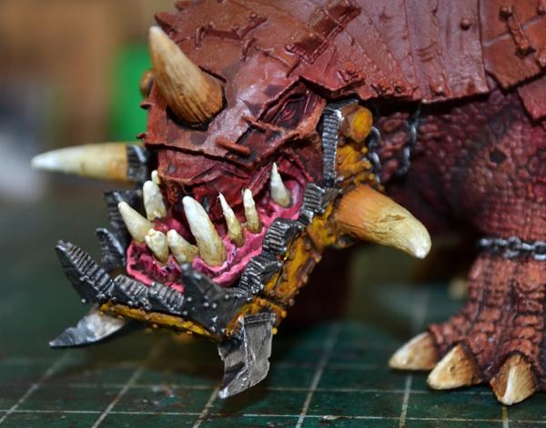 See, the armour on the gob is so marvelously mottled and the horns, teeth and talons have that nice gradation- but the only change in color you have on the scales themselves are where the wash pooled in the low spots, it seems.