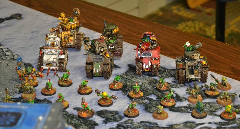 Game 1 was against a largely gun-line eldar army. Beautifully painted with no duplication of units, but much more competitive than my list. The mission was a version of "the relic". Great game where I stole the victory at the last minute by some tank-shocking shenanigans as recommended by my opponent (thanks Steve, very cool of you). The grot tanks get the MVP for pulling off the stunt that let me grab the relic.