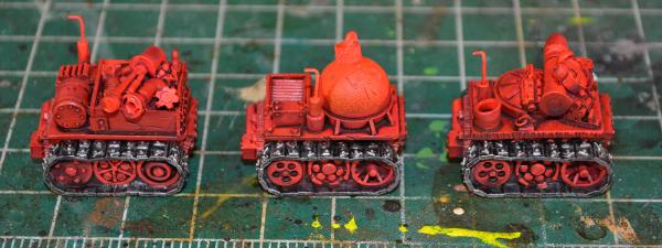 Hey everyone! Thank you for your generous praise and encouragement. Sorry for not responding earlier but I wanted to have something done on the squigbots before I posted. Just got some of the basics done... bots are airbrushed & washed and the tracks are started. Still a lot to do on both the bodies and tracks before I can move on to adding any details. Unfortunately these are so busy you can't really see any gradient from the airbrushing (plus the wash wiped it out), but I still think they're going to look good when complete.