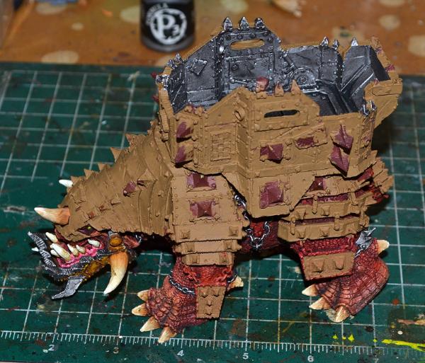 You know, I don't really dig the skin being 'fully painted' at this point. I figure, this is a Squiggoth. It's a Centerpiece for your army, and it's wonderfully detailed, and you're only going to be painting the one, probably ever. I think you should go further than just a flat color and a couple washes.