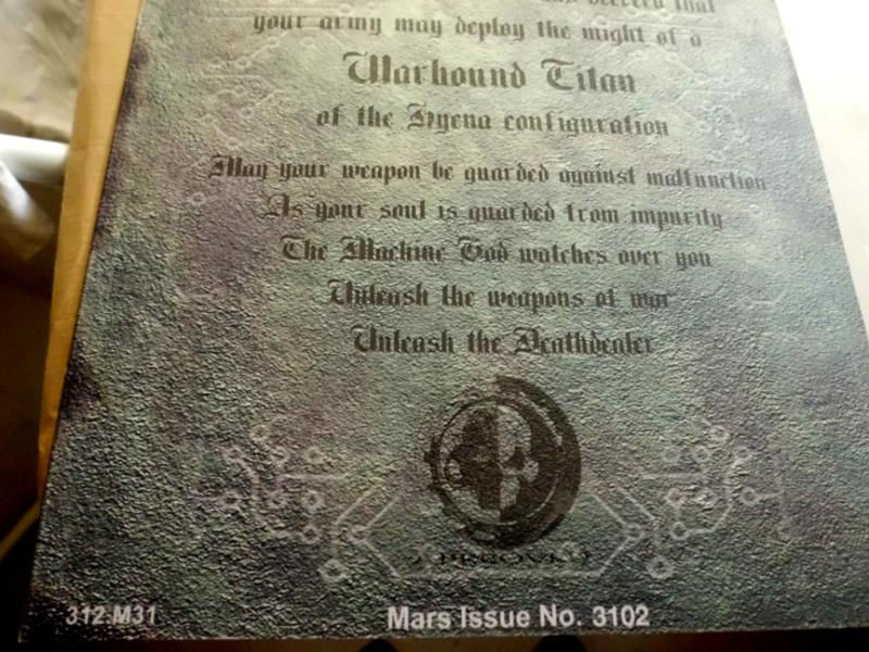 My Mars pattern Warhound 'Bello Canis' (#3102) came with a certificate from the Fabricator-General, so i recon anything larger will definetly have one!