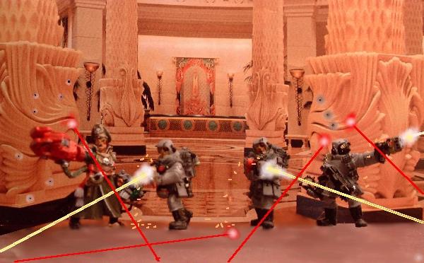 Lehman Russ in a village and in the woods trail. Commissar Yarick and stormtroopers at the temple and a unusual sight, Imperial trooper, (Catachan) on a jet bike. Made from an old Arbites jet bike with eldar wings on the rear.