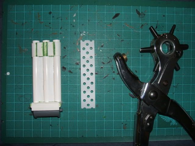 Well little bit more progress, I've done a little more work on the 'Helblade' turret I started on a while back, an Inferno Gun armed Baneblade, in order to get it ready to use tommorrow, that involved adding a sheath to the end of the barrel with holes punched in it using a leather punch, adding igniters from Cadian flamers to each barrel, and assembling the basis of the turret, still some tidying and detailing to add though.
