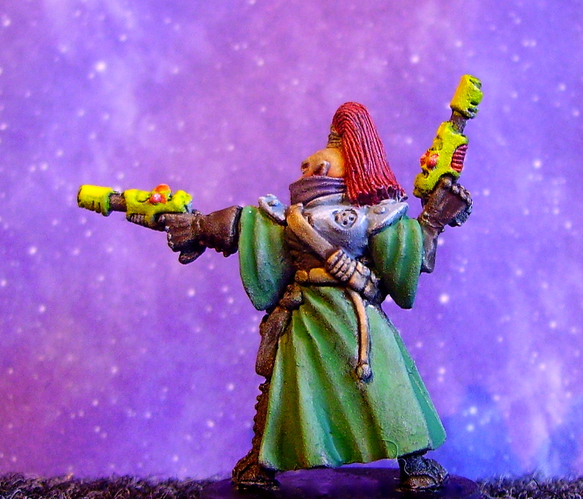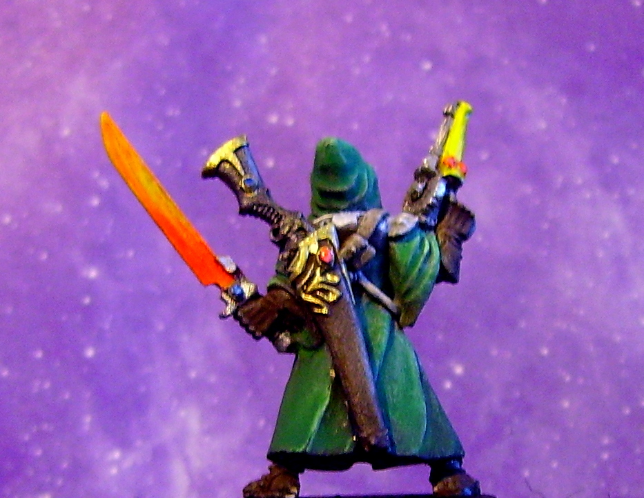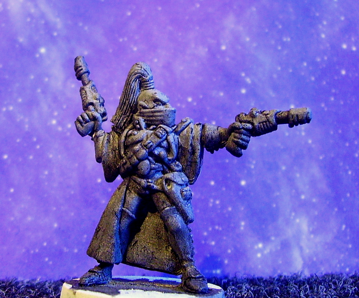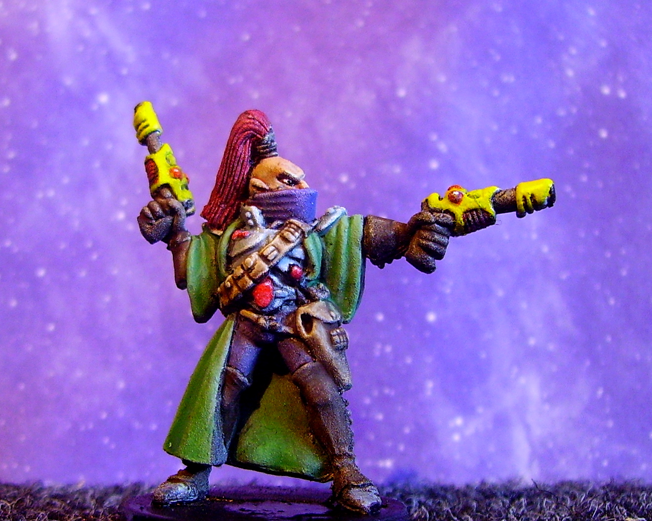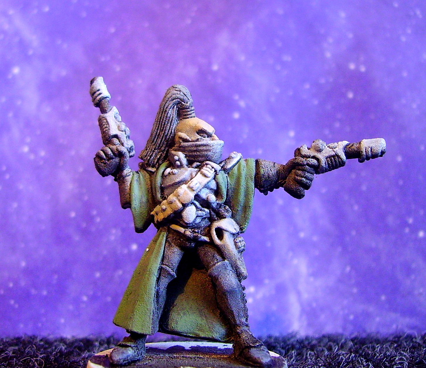 I'm painting an eldar! for the first time in 15 years... I think he is a scout, or maybe a trader or exile. He has two laspistols, a trenchcoat, gasmask and topknot.