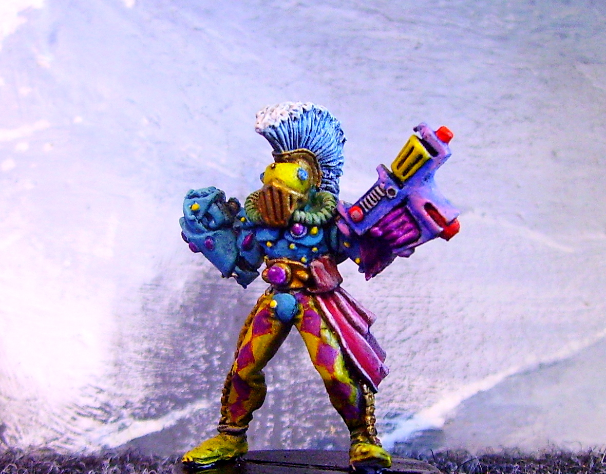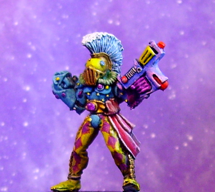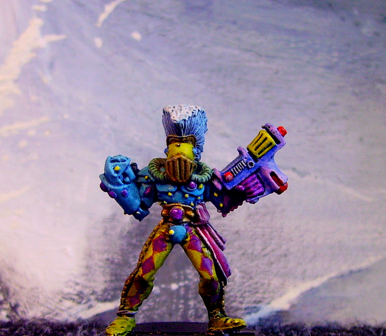 I'm definitely not finished with this one yet - another wash on the cloak wouldnt hurt. a dash of silver on the guns and a highlight for the yellow, More work on the gems and a few other details. He is my prototype eldar after all