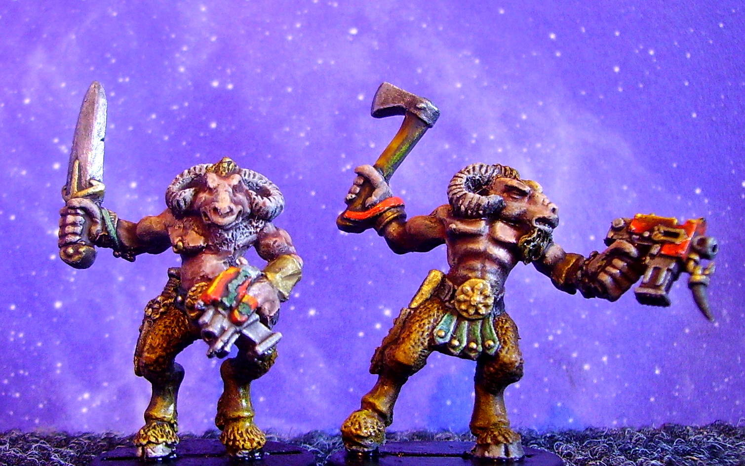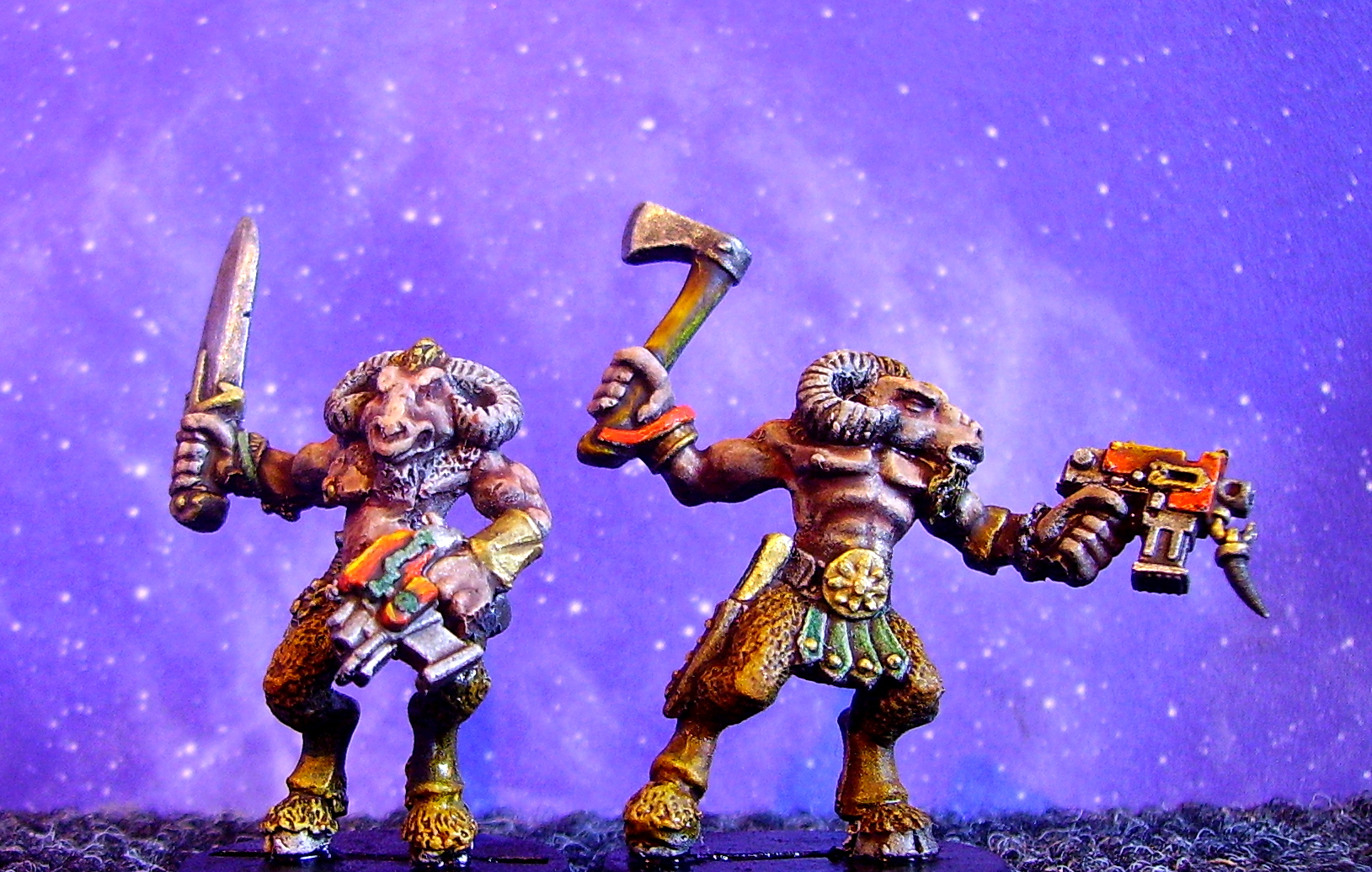 These Beasties have a khornish look - they are au naturele as far as skin, hair and horns are concerned. I'm very please with my naturalistic varnished pine axe handle(yellow with layers of sepia and umber washes).