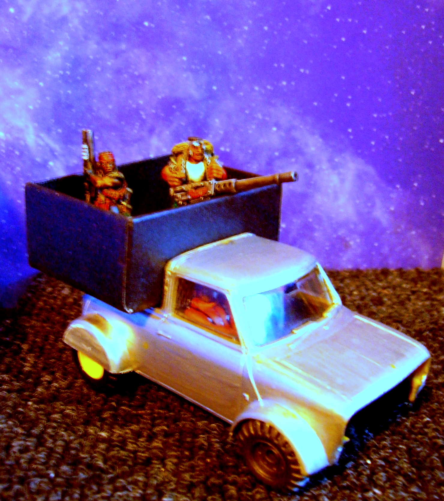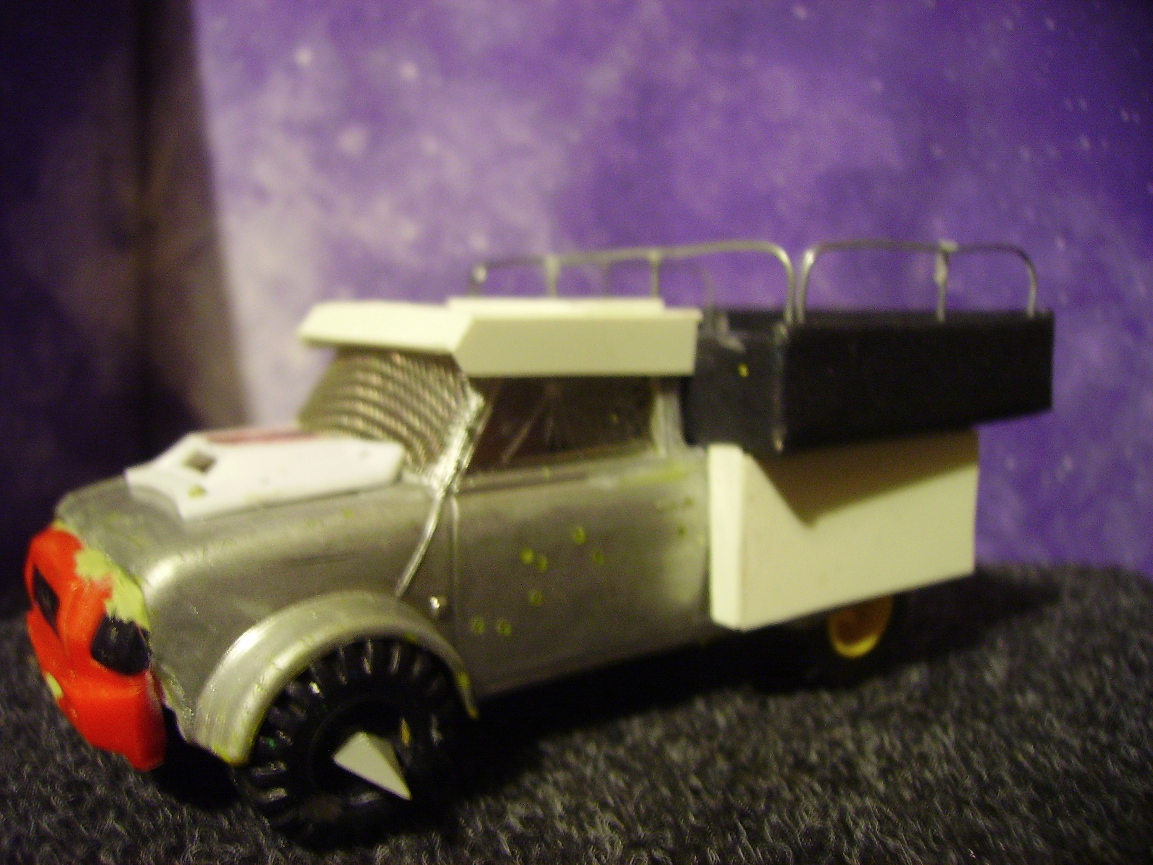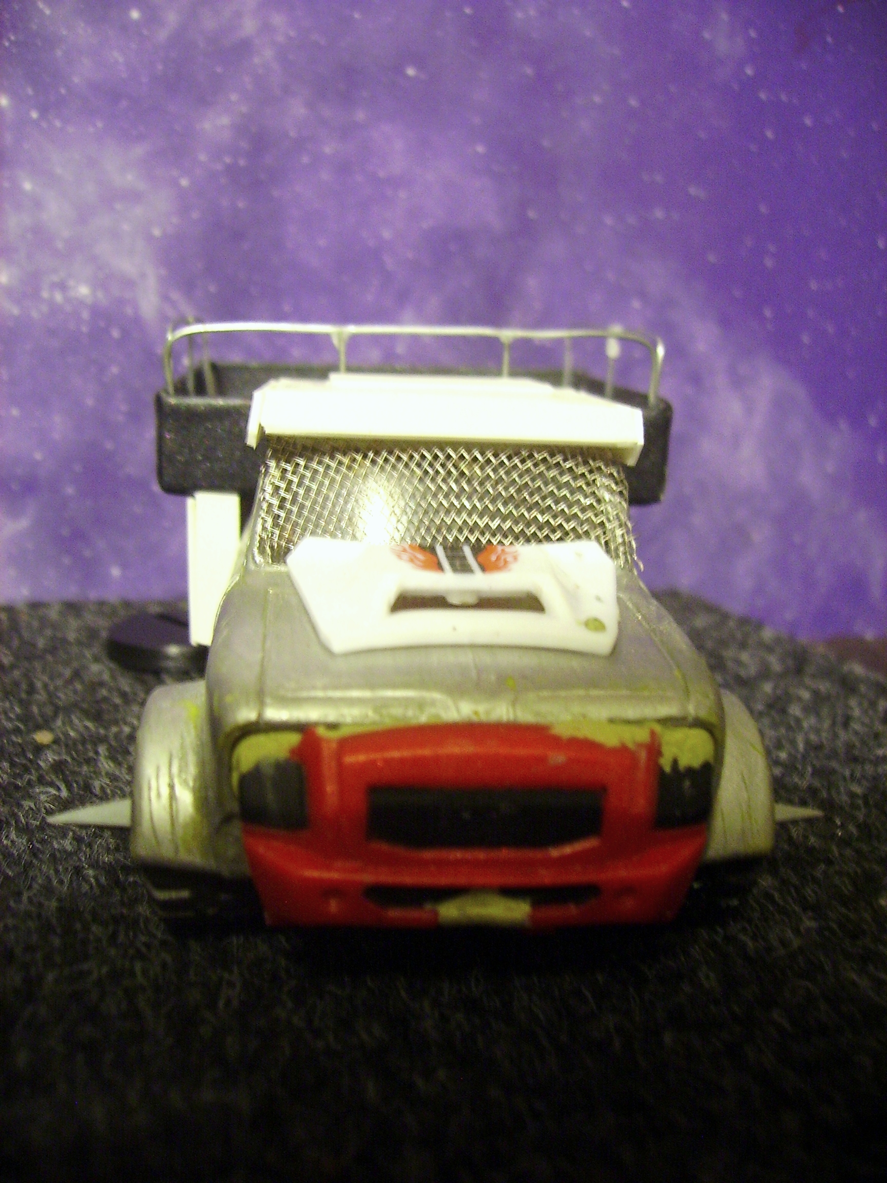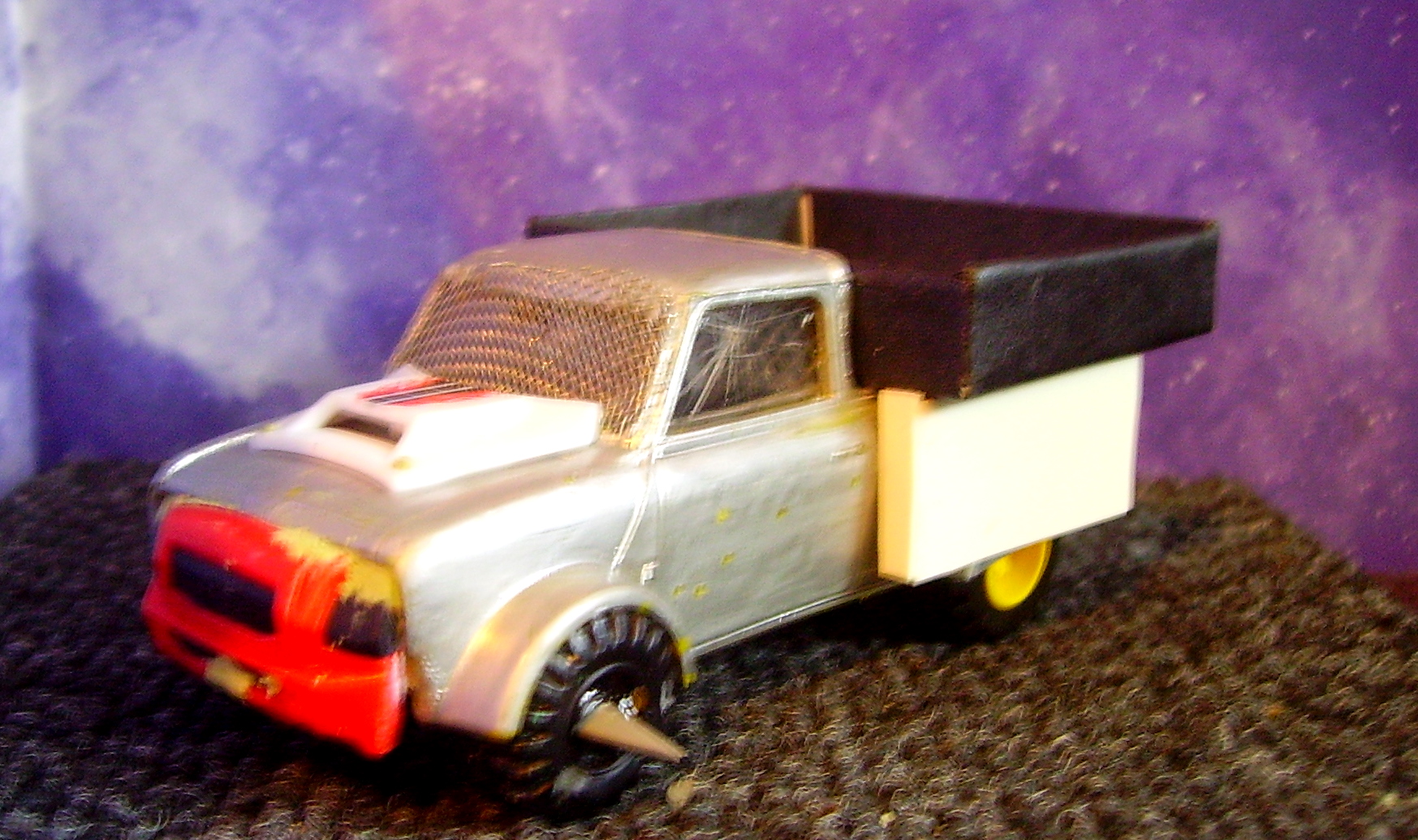 The front could do with a spiked bumper maybs, and I have no suitable gun for the roof yet. - maybe a little more armour plate on the doors. a ladder on the rear would look good as its very high and they would need one to get in. Lots and lots of rivets are also needed. Then a rusty paintjob