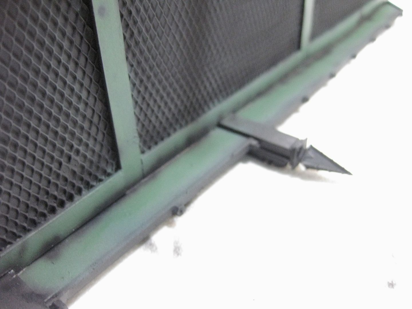See the green overspray on the ornamental spiky bit posts and white spots where the primer didn't quite get?