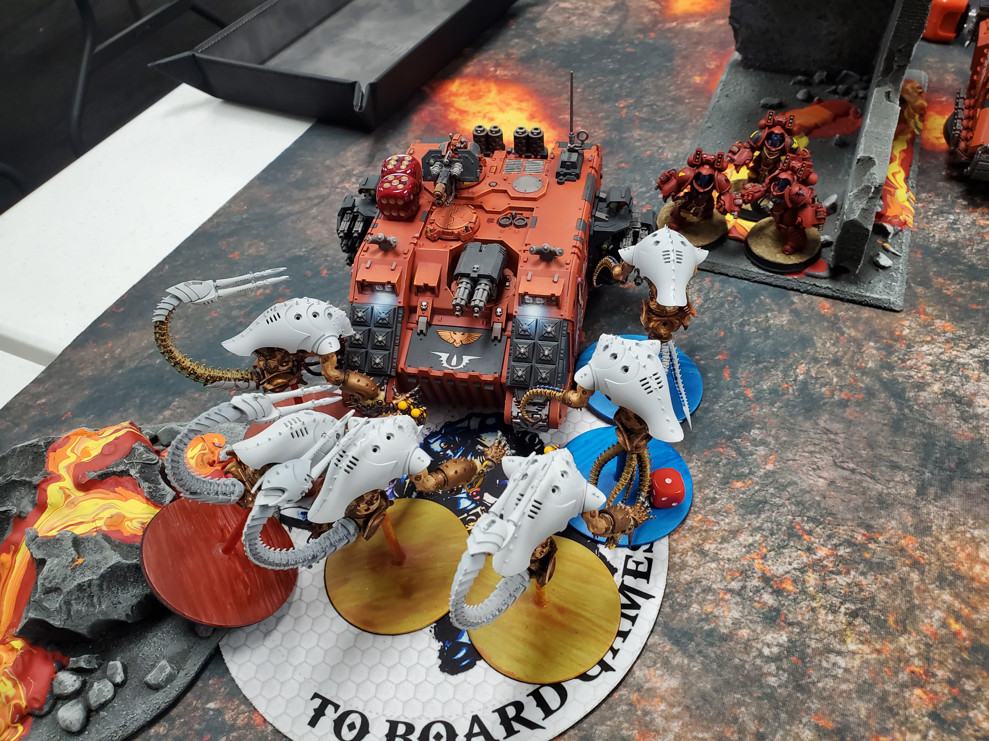 Khaine vs khorne. Jaws of gallet. Made mistake going first. Then was in icky spot give double and lose chunks or take priority and my objectlves burned. And blood tithe used to tag me so primary points were 3 2 1 and for last 2 turns can't while he scores 3 every turn.