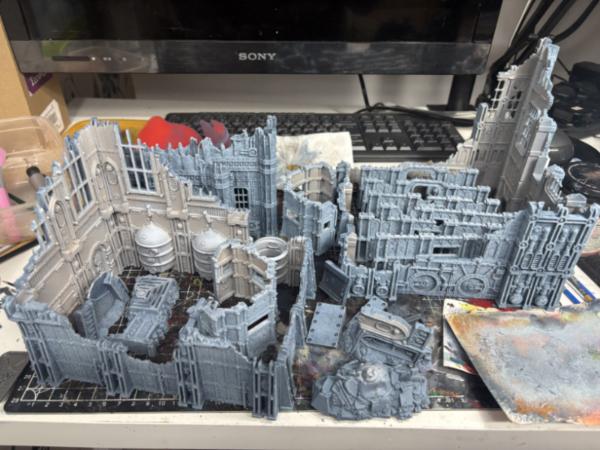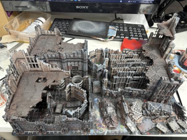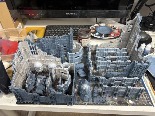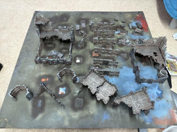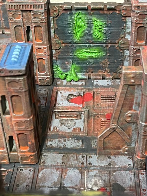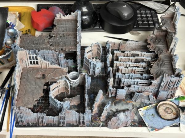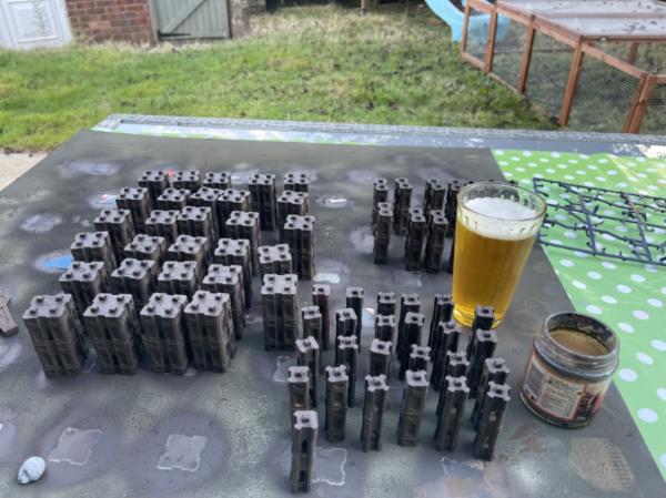 On the hobby desk has been the Volkus terrain. I’ve been loosely following an Vince V terrain Hobby Cheating video so against my judgement I decided to do the oil wash before blocking in all of the steel and other colours. I think that was a mistake in hindsight but I’m committed now. The oil wash itself went pretty smooothly, though some bits just didn’t want to rub off, perhaps I waited too long (only about an hour) before sponging them down.
