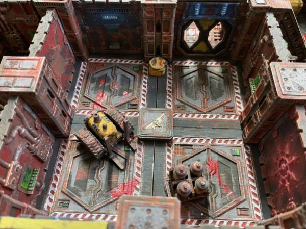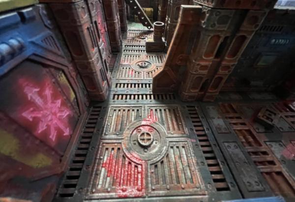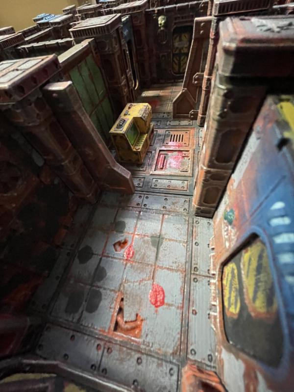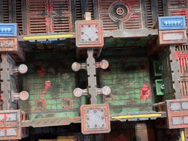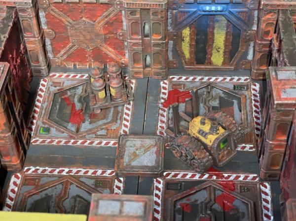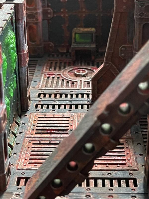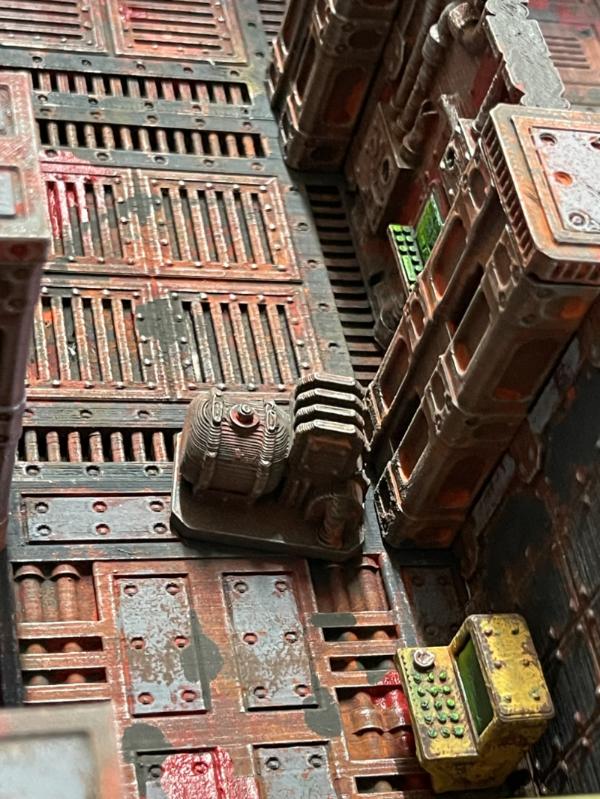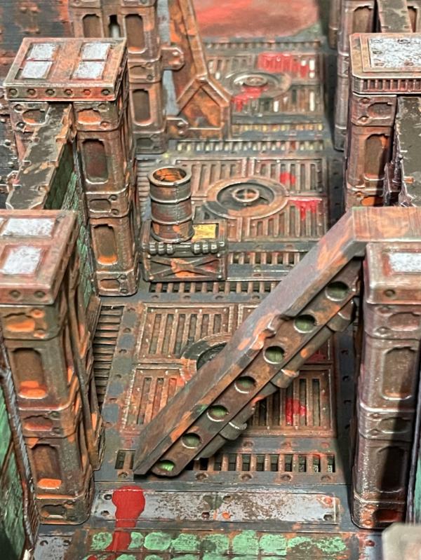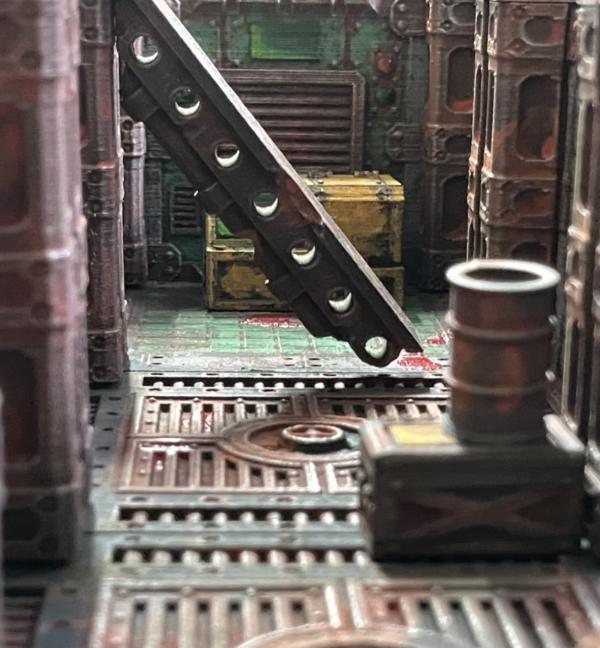 Post the messy oil wash I battled the stink and slapped on some Dark Gunmetal on most of the bracing similar to the Kill Team Barricades I did last year. I also made a start on a few bits that will be Boltgun metal like fallen bits of floor and the tanks.