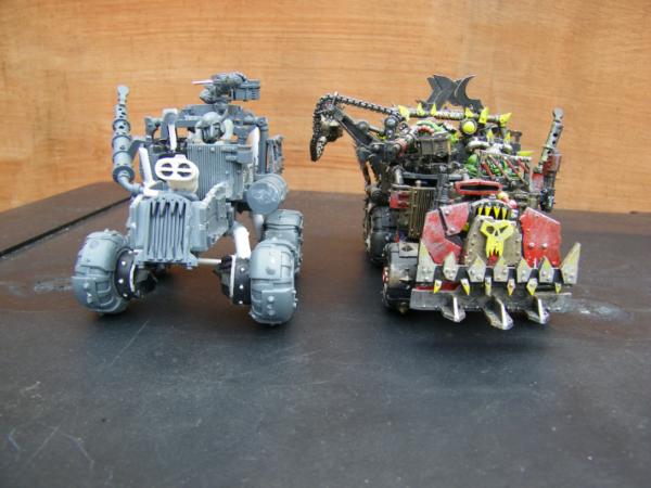 Deployment Boss Rukkstomp placed his entire force (save two units of outflanking deffkoptas) in or around a large ruin in the center of the battlefield, close to the relic. Lootas, grot infantry and kans on the inside, trukks loaded with boyz, burnas, nobz and tankbustas on the outsides. Boss Gitsplitta set his artillery units high up in some ruins on Rukkstomp's right, along with some biker nobs and gretchin as support. His heavy assets... grot tanks, megatank and meganobz in a big squiggoth were deployed opposite the opposing force, hoping to blunt Rukkstomp's dash for the relic and claim it for themselves.