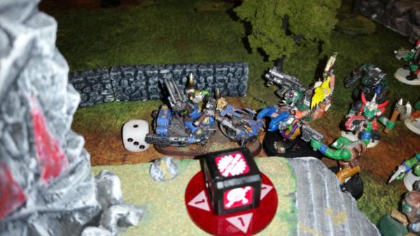 Turn 1 In the gloom of the early morning, Boss Rukkstomp bellowed and his warband moved forward. The roar of engines and howls of his boys announcing their violent intent. Everything moved forward at top speed, eschewing shooting for firmly establishing control of the middle of the battlefield and the relic. The semi-darkness prevented any effective shooting from taking place... even by ork standards!