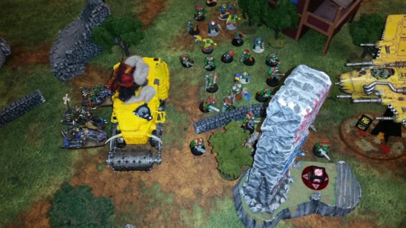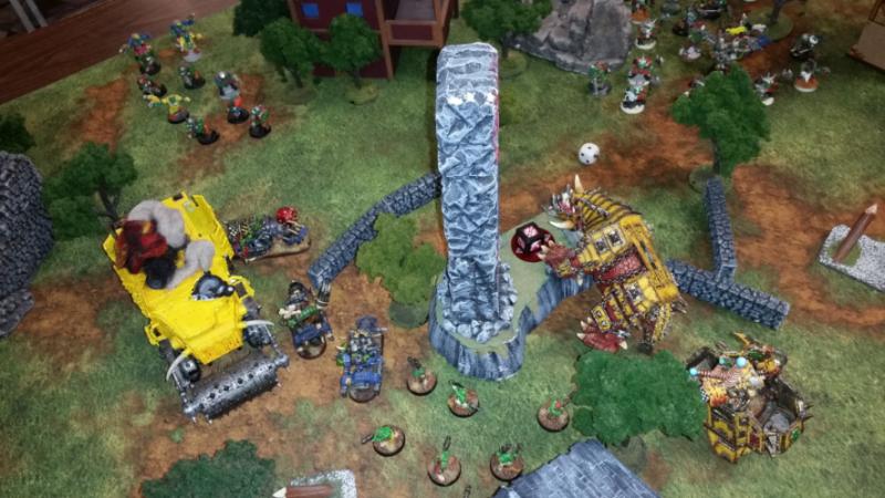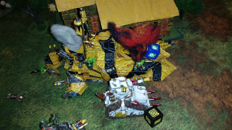Artillery rained down on Rukkstomp's forces and the squiggoth & meganobz charged the two trukks full of boys by the relic. When all was said and done, 4 of 5 trukks were either smoking ruins or immobilized and many boys had been killed.