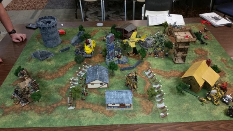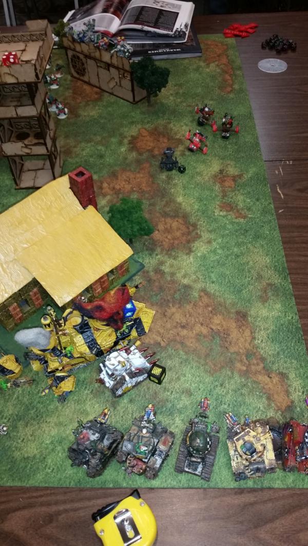 Epilogue: As the dakka jet pilot banked away to head back to his airfield, he could see the carnage below. A lone "camouflaged" battle tank of grot construction stood nearly undamaged in the middle of the field. He could just make out a rather unhinged looking grot on the observation deck, jumping up and down and waving around what looked to be a teeny-weeny power klaw. Straggling gretchin were staggering out of cover, looting bodies and preparing for the rather daunting job of cleaning up the mess.
