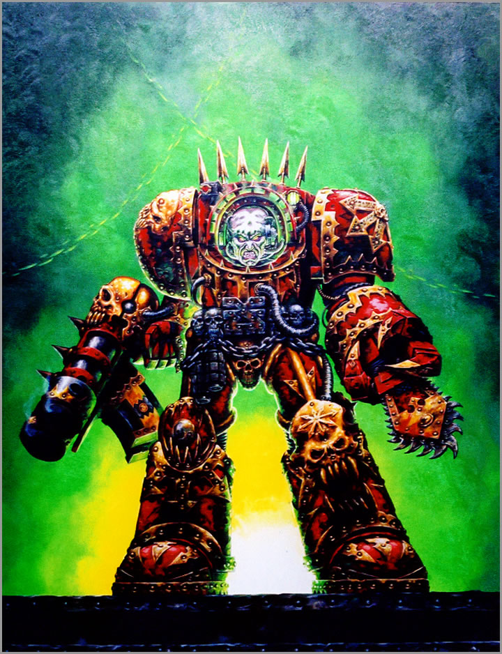 Light overspray of olive over black and red spray base. Random large splodges of macharius orange, mechrite red and dark flesh. Badab blsck and devln washes. Chainmail drybrush, dark flesh stippling and selected variety of washes: