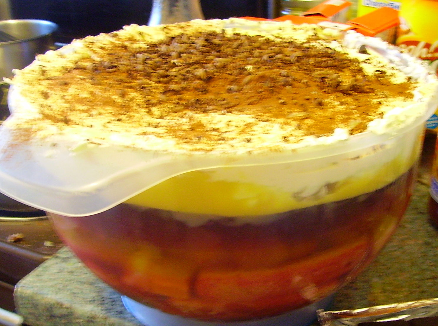 Trifles vary wildly but are all amazing. I like them with fingers of sponge soaked in sherry, then covered in strawberry jello, with a layer of custard and then topped off with whipped cream and chocolate sprinkles.