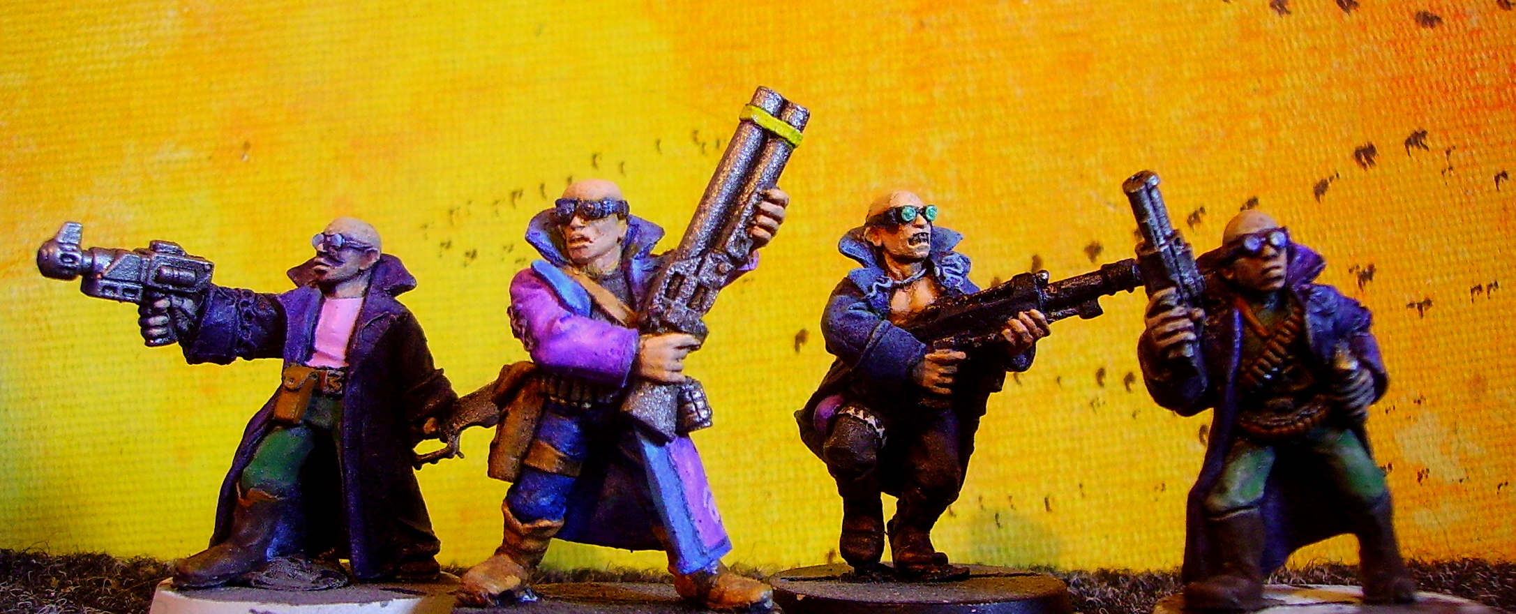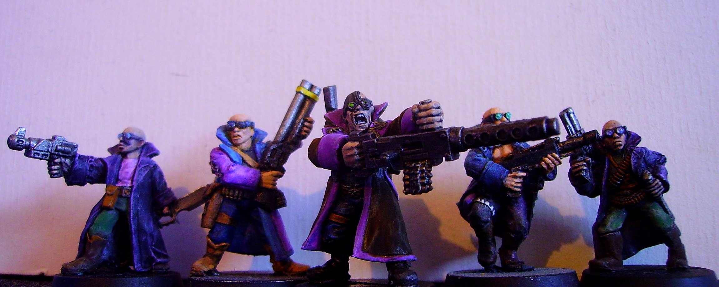 I have been working on these guys for a while - the two older gangers I had already painted but I am in the process of making them pale skinned vault (sorry I mean hive) dwellers with sensitive eyes and just a hint of alien genetics. They are to be dirtied slightly too. Genestealer cultists always strive to fit in and hide their true identities until the time is ripe so not too bright. But a hint of the alien and lots of purple is mandatory.