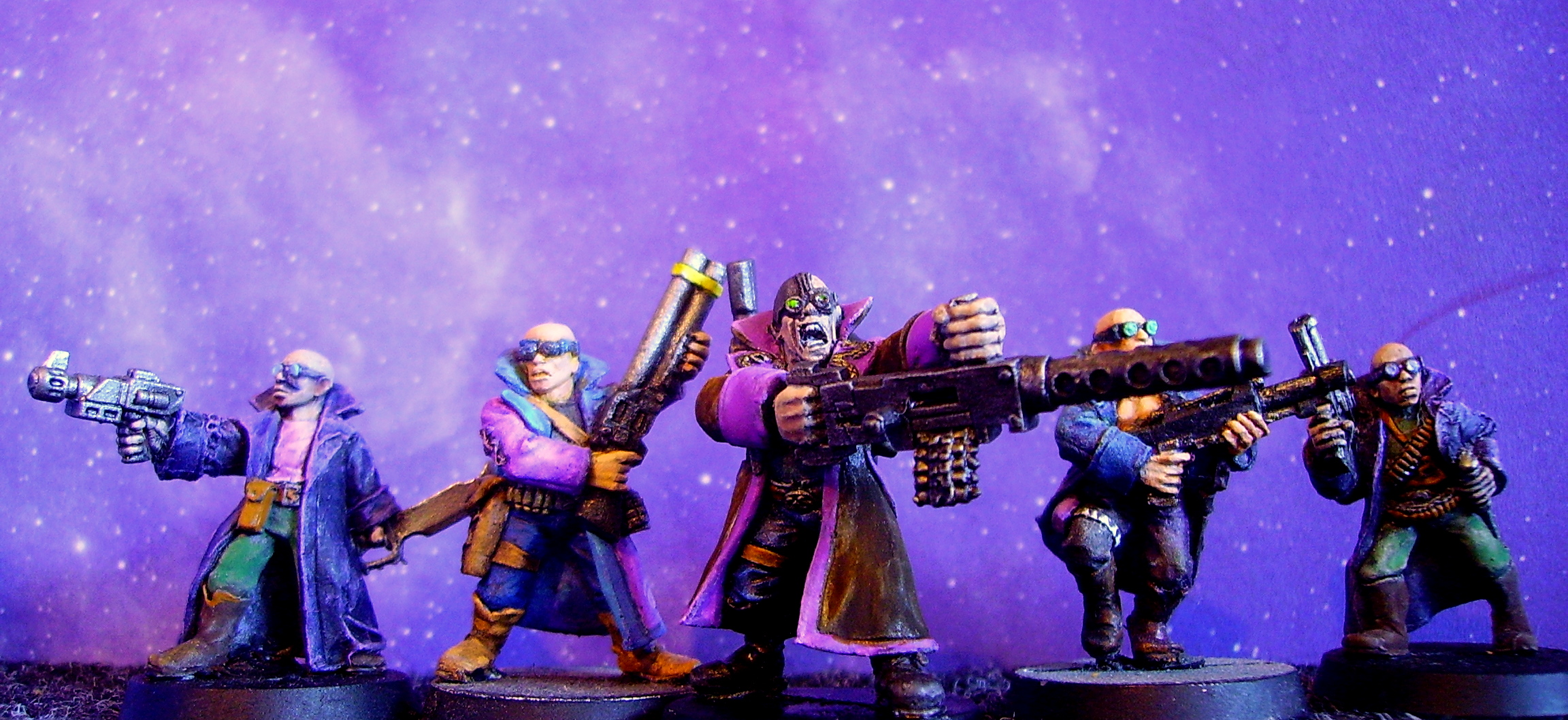 Plus I love the idea of bald guys with bar codes on their foreheads. I'll post one of them also when I'm done. I finally got the first three in the mail today. That brings me to three delaques, a space pirate and a space thug. Now I need to find an adeptus arbites figure to serve as their taskmaster, and find four more. I should have two or three more delaques on the way. OH, and I have a Van Saar with autogun already and one with a heavy stubber on the way. That takes care of my heavy weapon (counts as heavy bolter) and the assault weapon (multimelta on the space pirate counts as meltagun.) All I'm really lacking is the one arbite. Every ebay listing has been for a whole bunch of them, and I'm not sure I can order just one from GW any more.