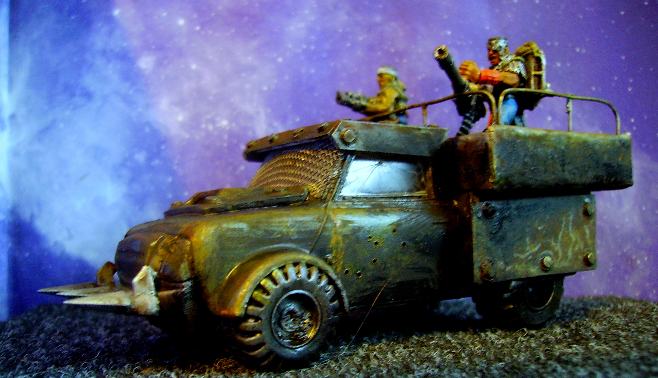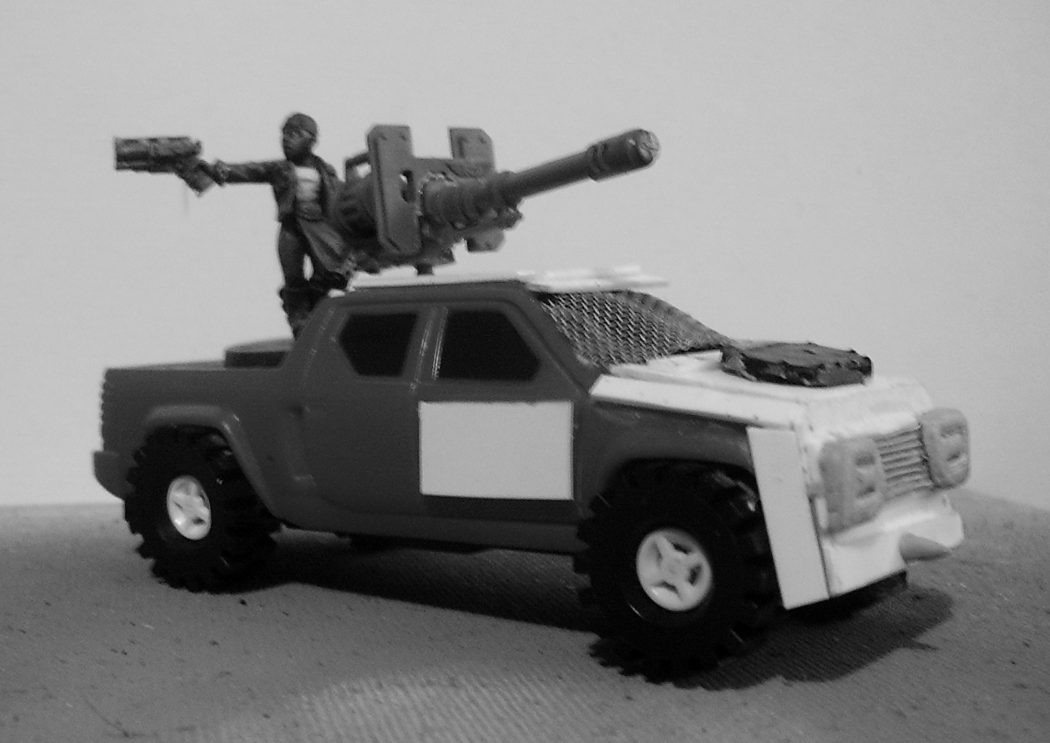 Continuing experiments in rustyness on my rhino (10 layers of paint so far), and a libyan style, looted imperial heavy weapon mounted on a pickup truck!