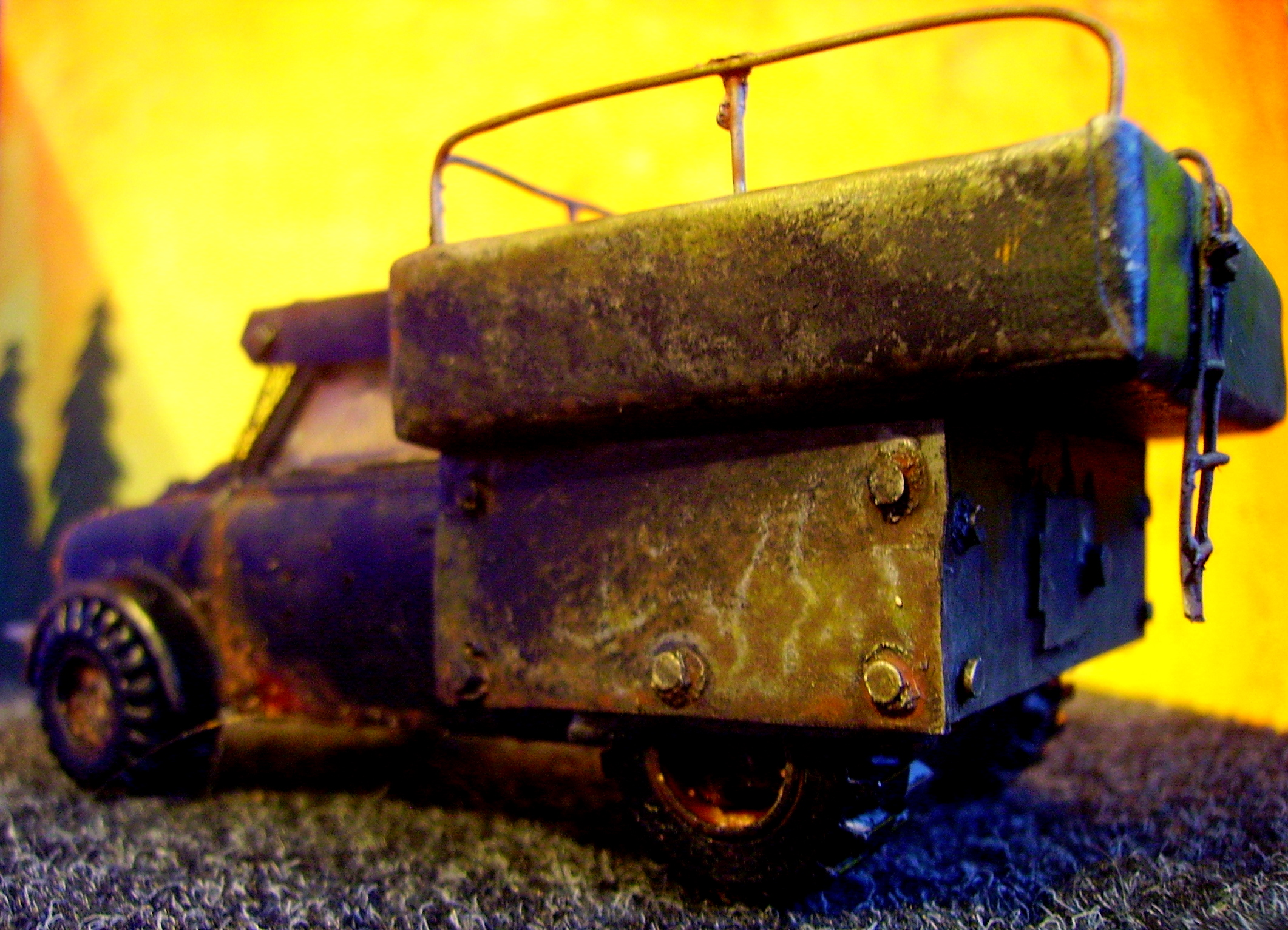 er... about that truck! splendid! i think this will be truly grnad and the best part will be it will be a great inspiration for lots of peeps to to likewise! i scoured the fleamarkets for quite some time now and never found a good matching scale for some old toy to be hacked apart to be later reborn as a nice gaming model....