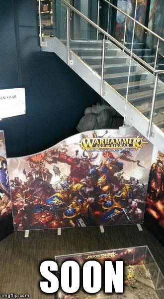 I have nothing against Age of Sigmar, I like the models, but that seems very sad to see the big marine shoved under the stairs and I just made myself laugh imaging him falling forwards right through that display.