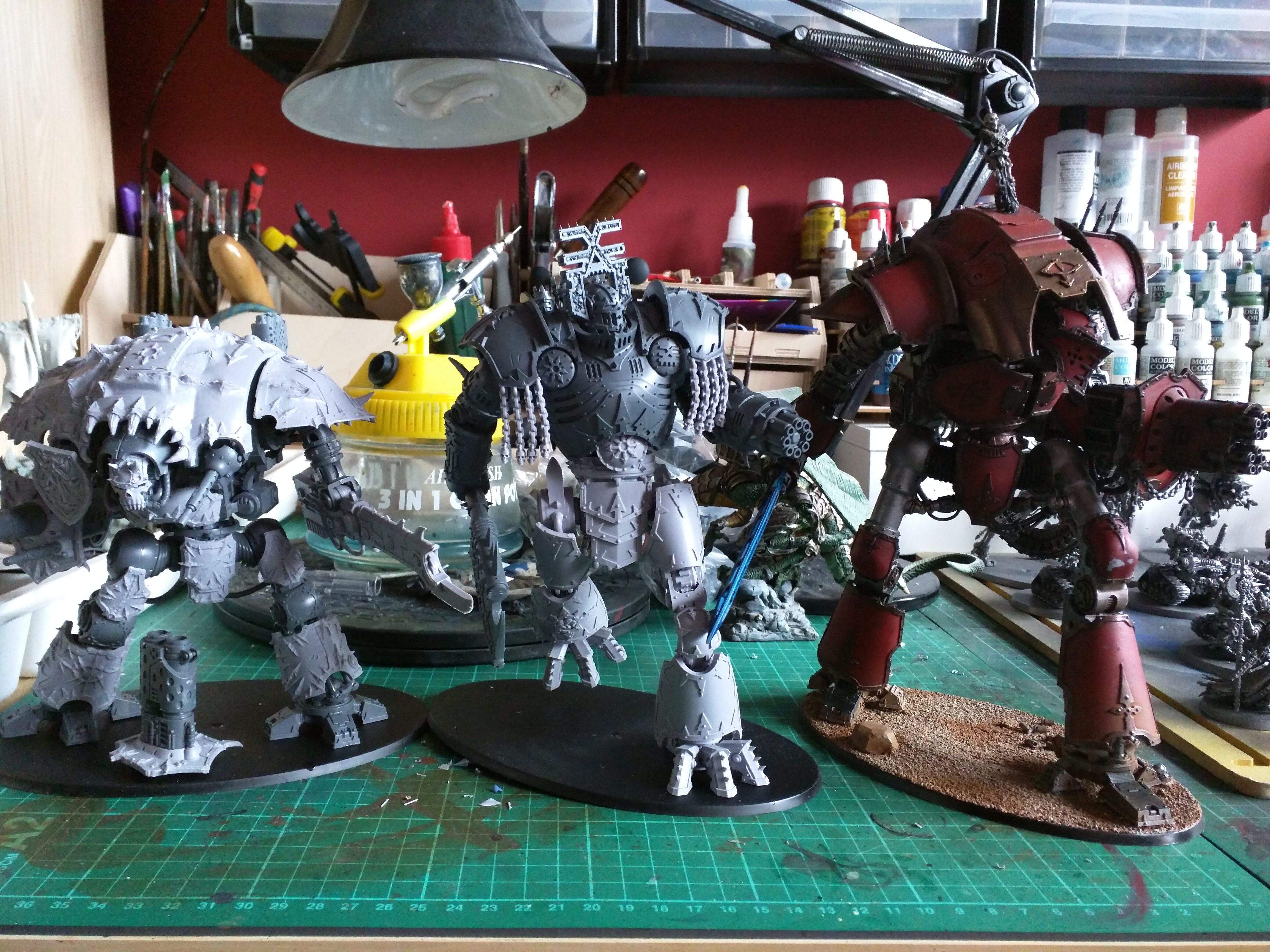 The suit has three pilots, and you may be able to see the three entry hatches on the front in the photo: he imagined the central one to be in charge, with lesser ranks either side, much like a Princeps and Moderati for an imperial Titan.