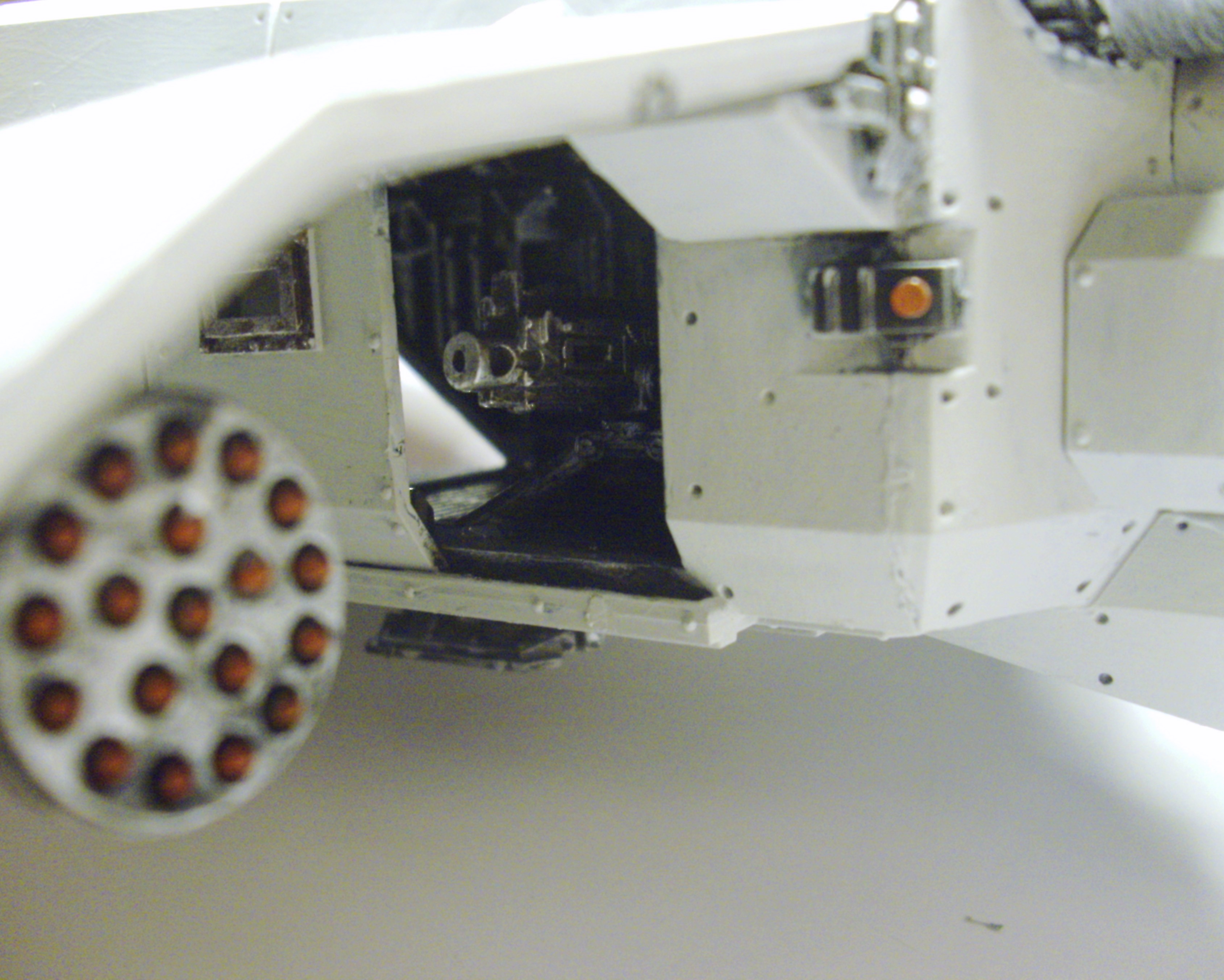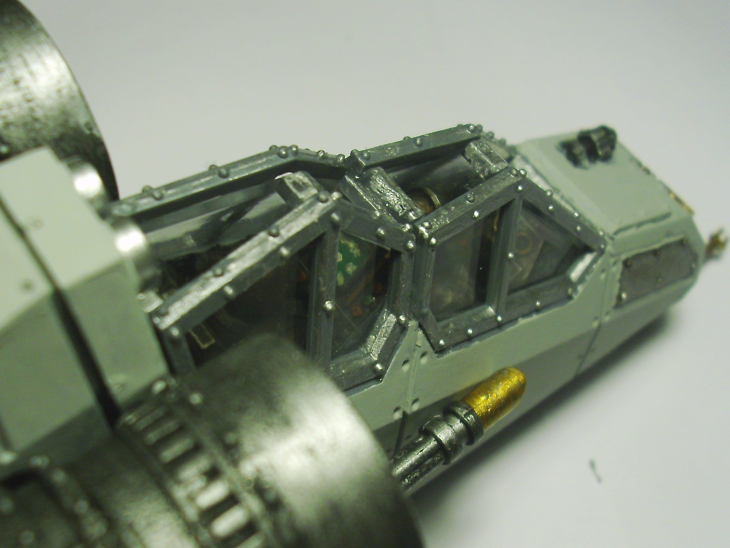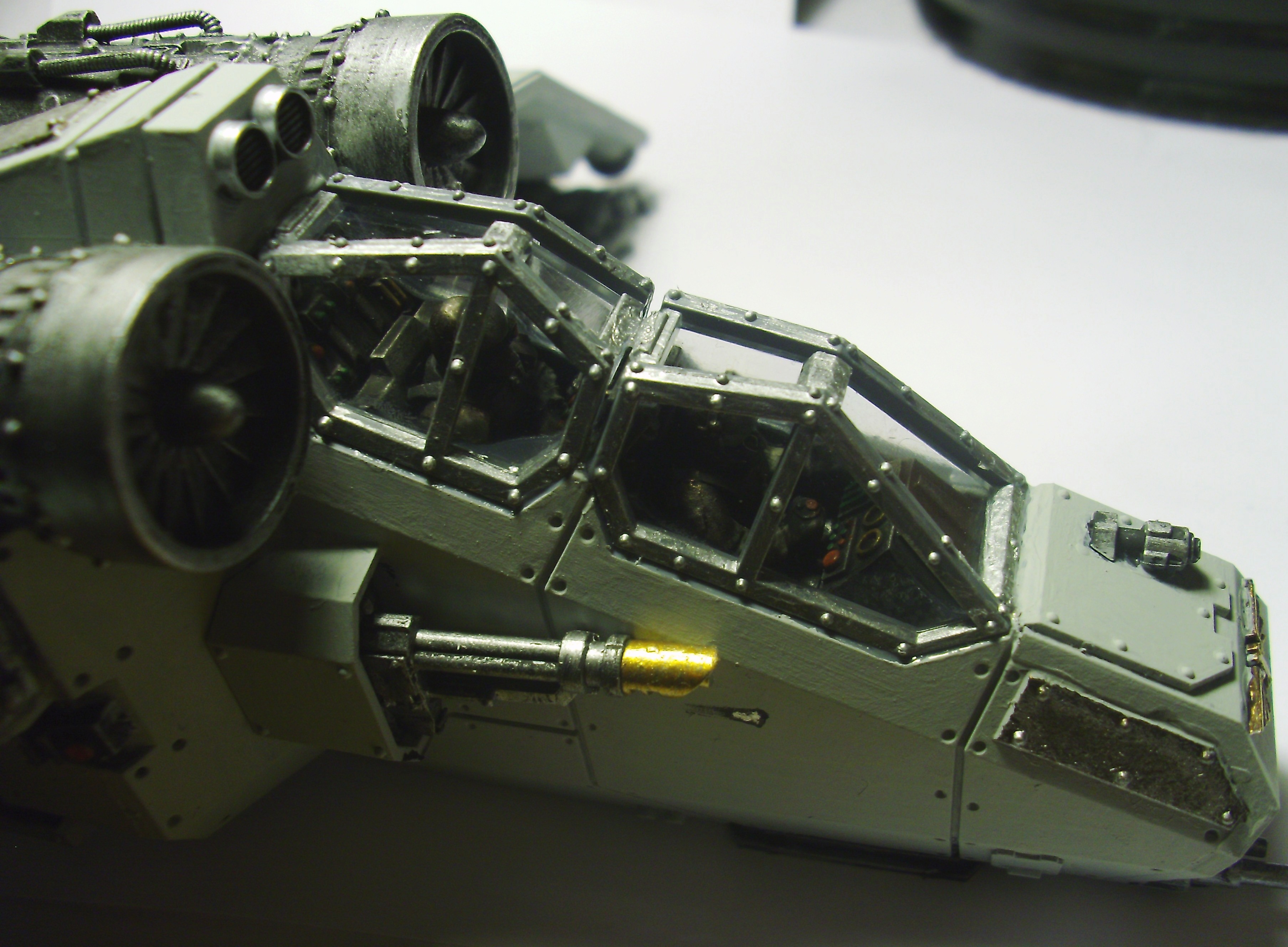 I've been getting some painting done on the valkyrie... in fact I put in 6 or 7 hours worth of it in just today alone! I got the cockpit and crew completely painted, and put in the canopy. Basecoating the gray took FOREVER, since I do it by hand. I had to thin the paint a bit so it would not get too thick and blotchy, and then I had to paint on several layers to get the coverage I wanted. I wish I had done more detail on the interior, but since it was so hard to get a brush in there I had to settle for a quick and dirty metal drybrush. I got some pictures of my modified sponsons, however. I am using the bodies of the gunner crew for a pair of meltagunner vets (pics of those tomorrow, hopefully), so these remain unmanned. The crewman bodies just looked too awesome, and I thought they'd make fitting stormtroopers if anyone wanted to try the conversion.