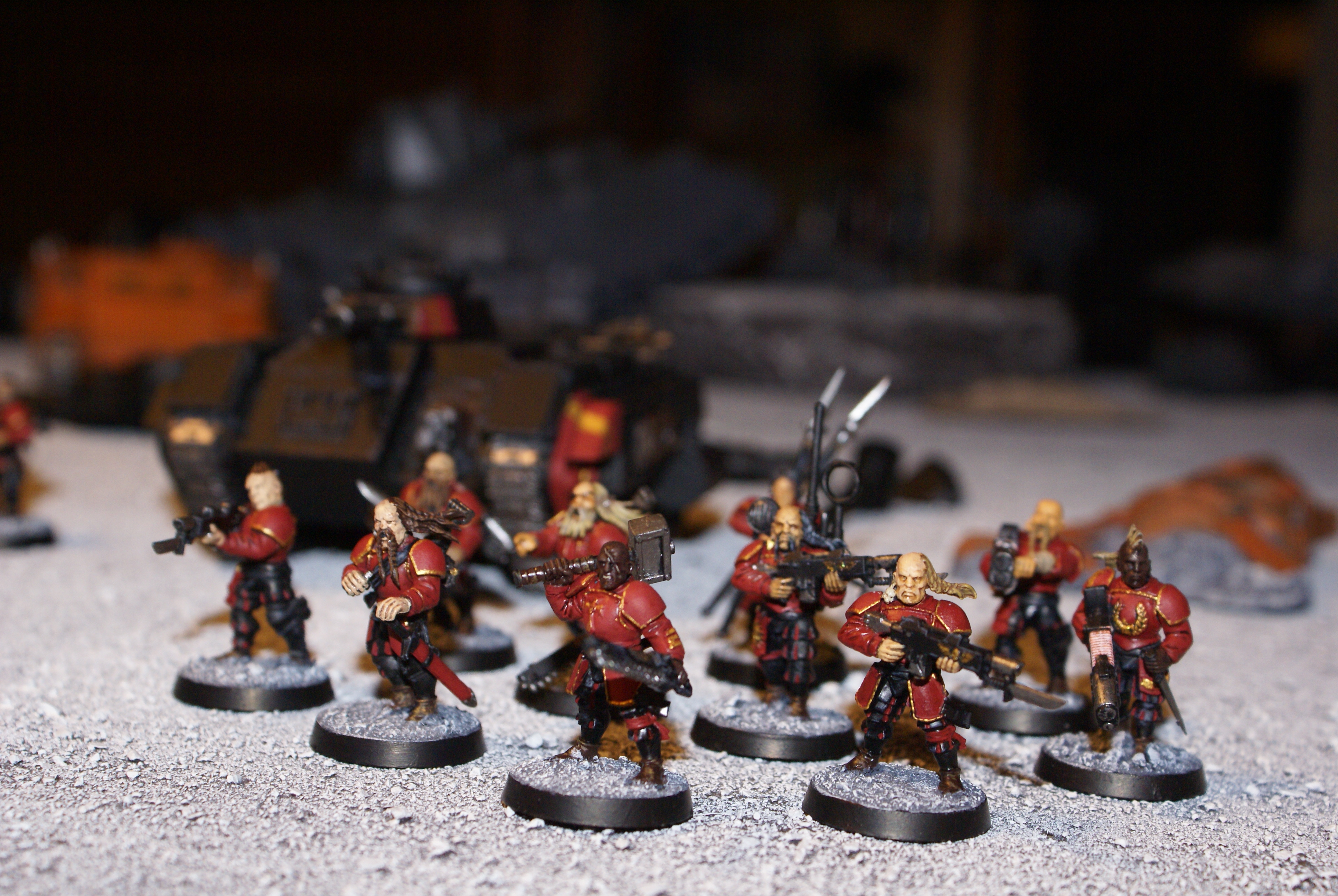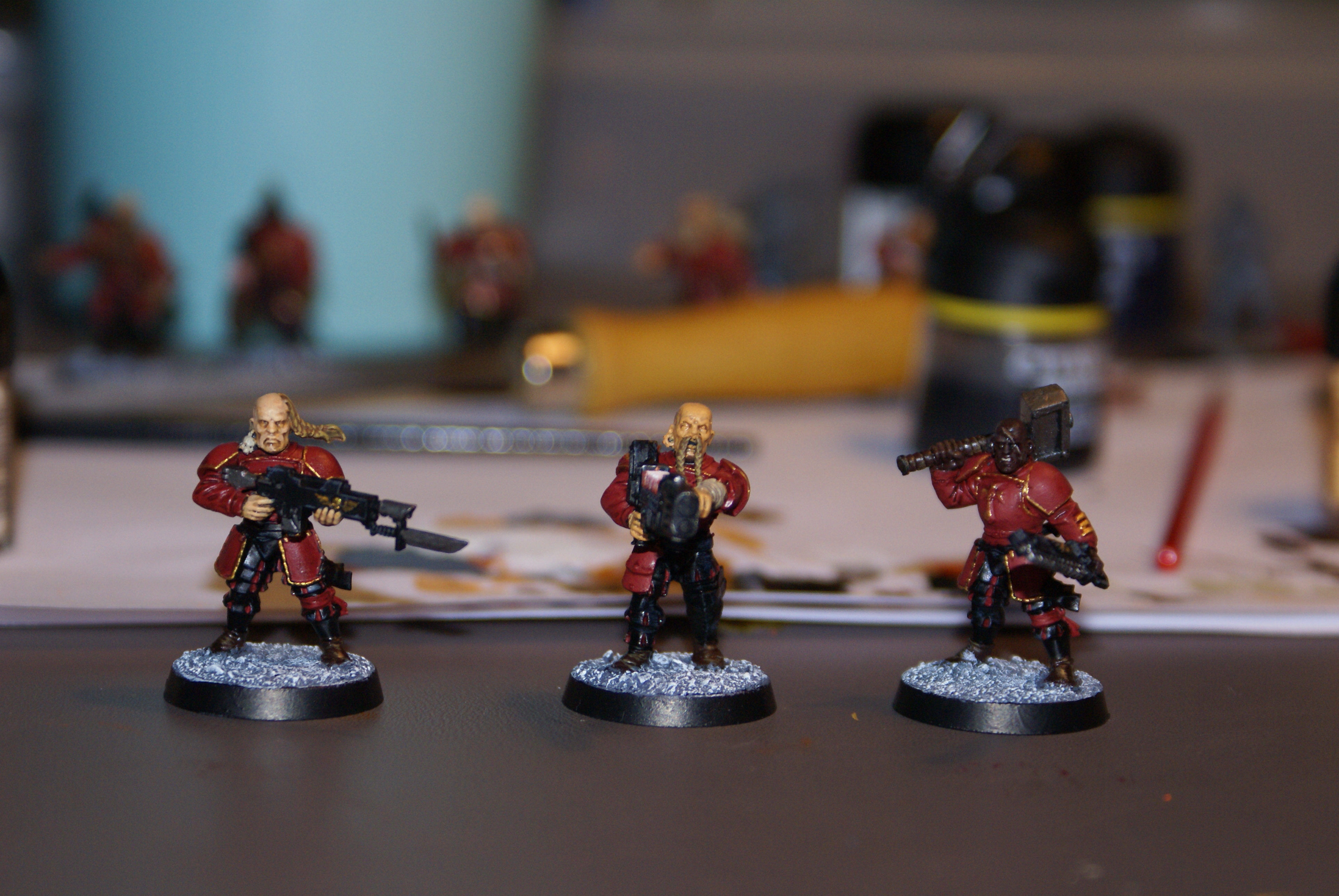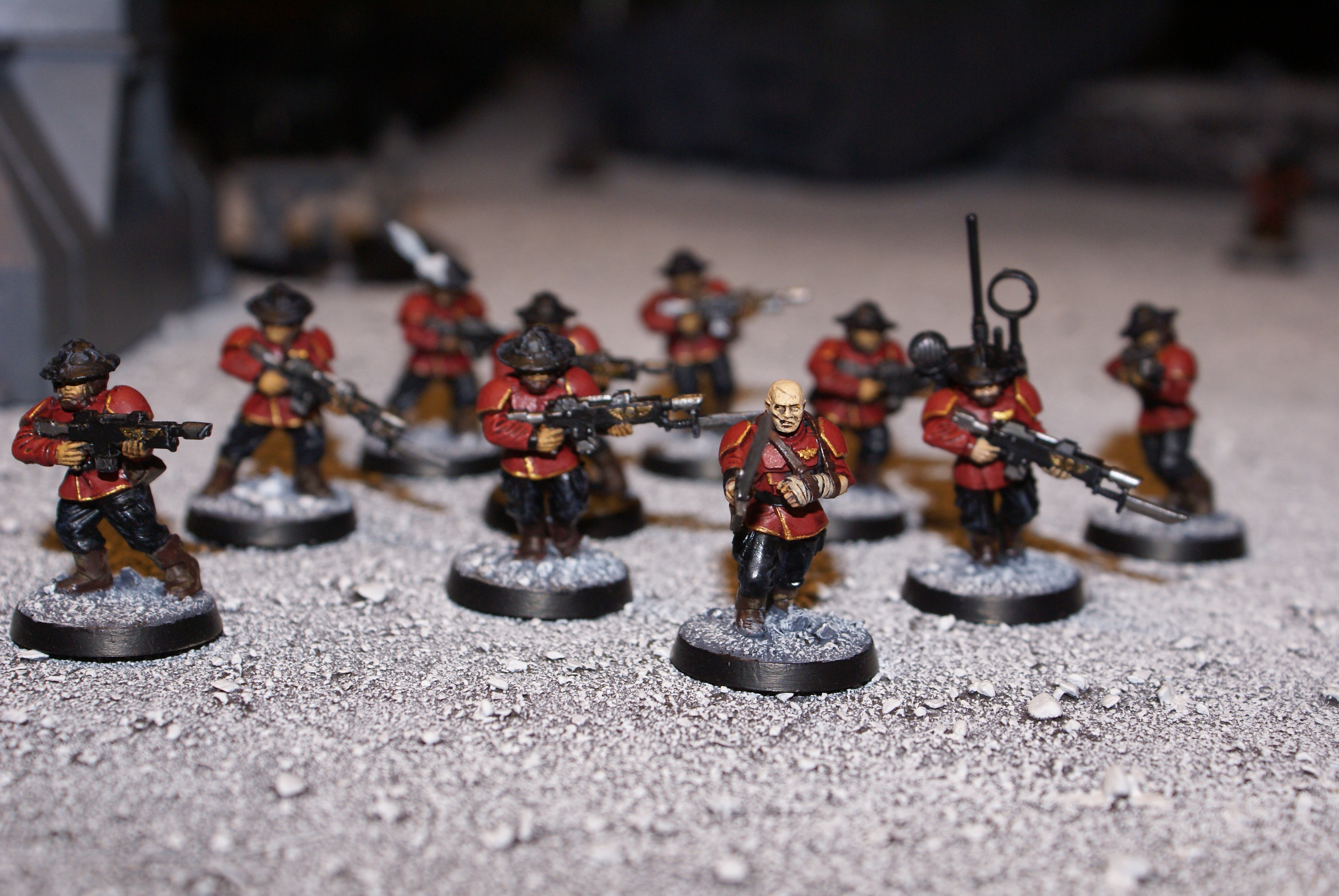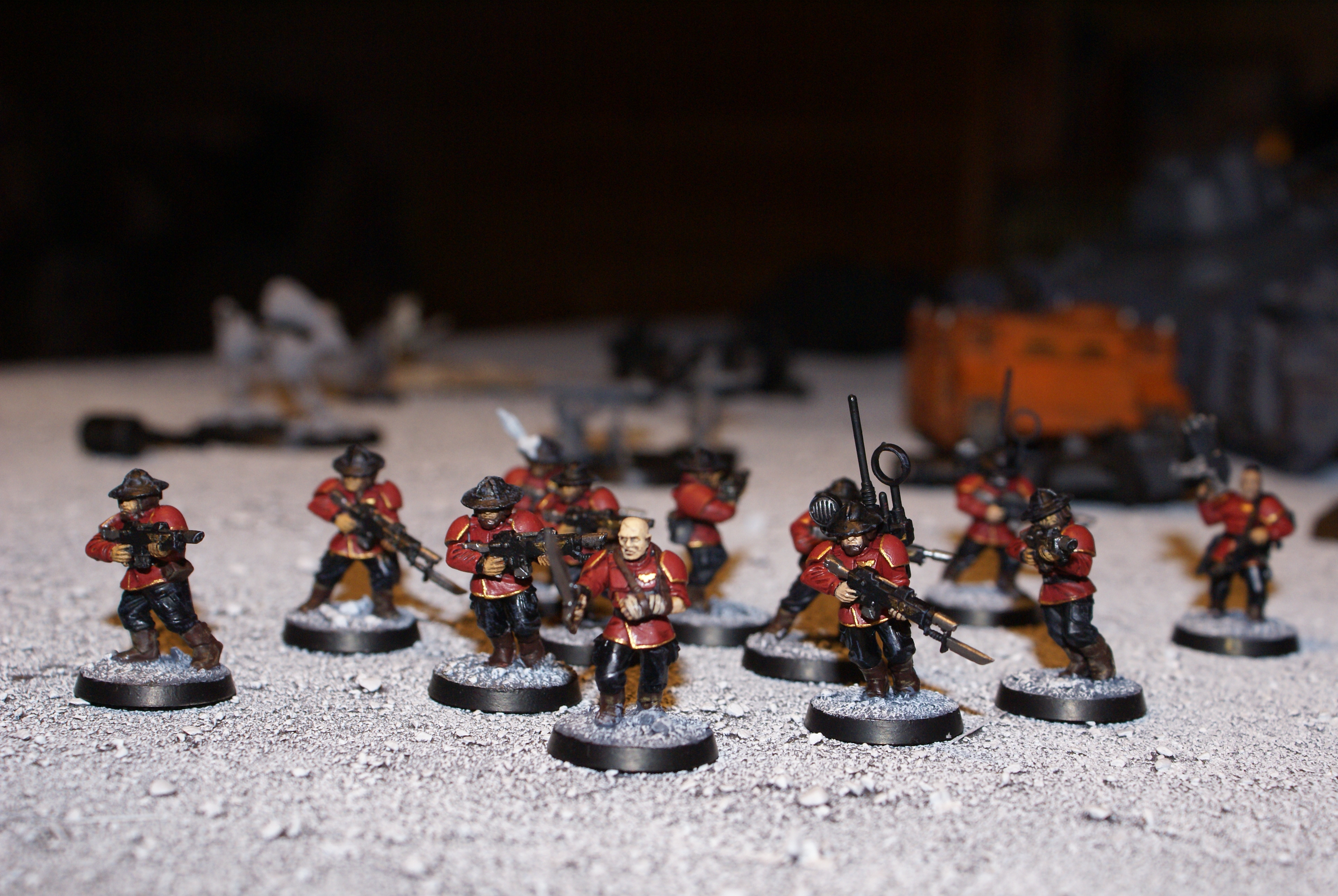 This is my first post here, and I am working on an imperial guard army, with minimal conversions, just switched the helmet. Some of my leaders and veterans will be converted a little more. Anyway I can not find a color scheme that I like to save my life. I have been bouncing around different ideas for months now, and I could really use some help. Any ideas would be greatly appreciated. I kind of like the red, but am not married to the idea. Thanks for the help. Here are some pics of what I have so far.