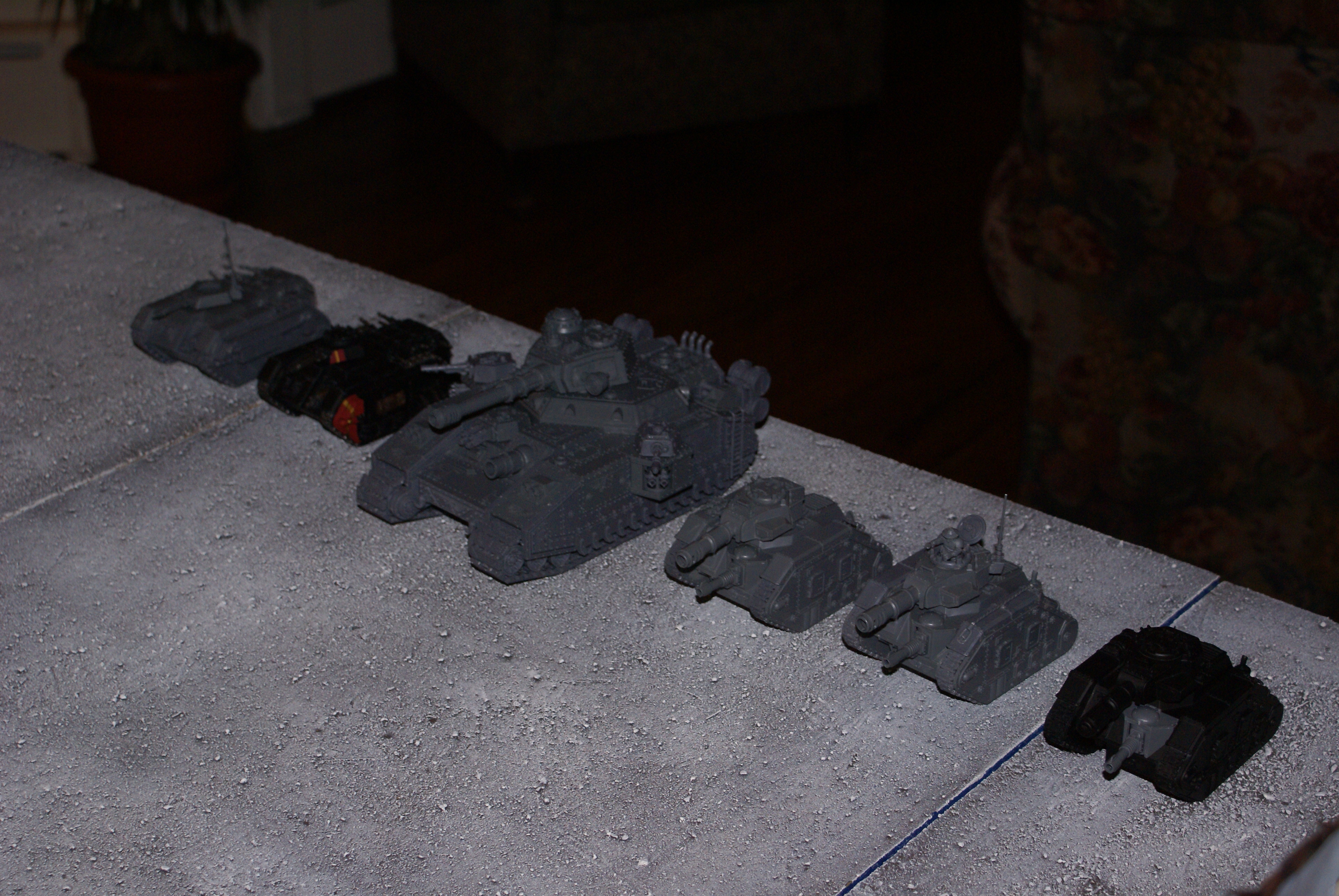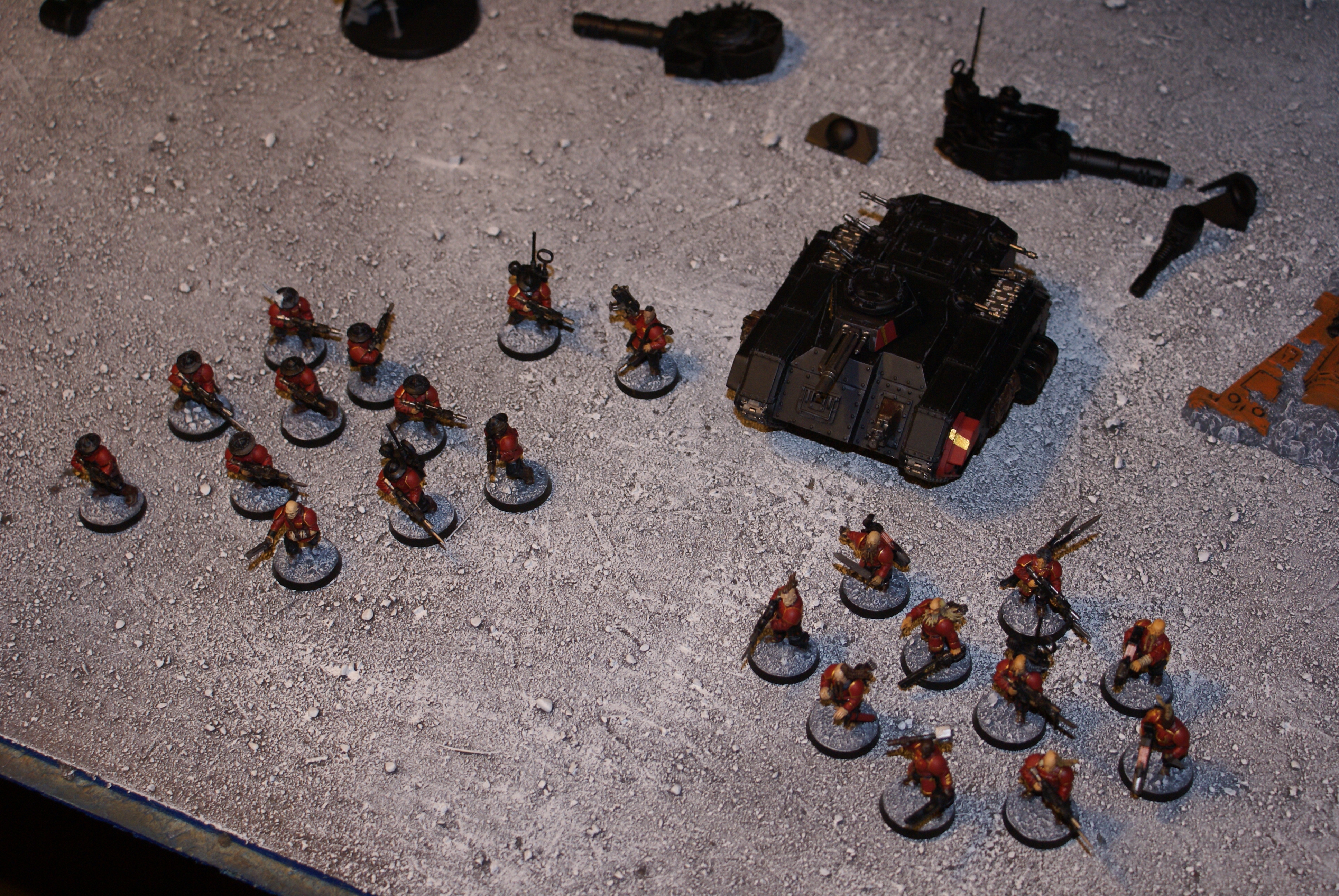 Again thanks for all the help so far, I have decided on the red and black color scheme for the guardsmen. I haven't posted in a couple of days while I was away. I am now trying to think of a color scheme for the tanks. The base will be a simple snow pattern, you can see it on a couple of the models already. I am not sure I want to go with a snow camo pattern for the tanks, and any suggestions would be much appreciated.