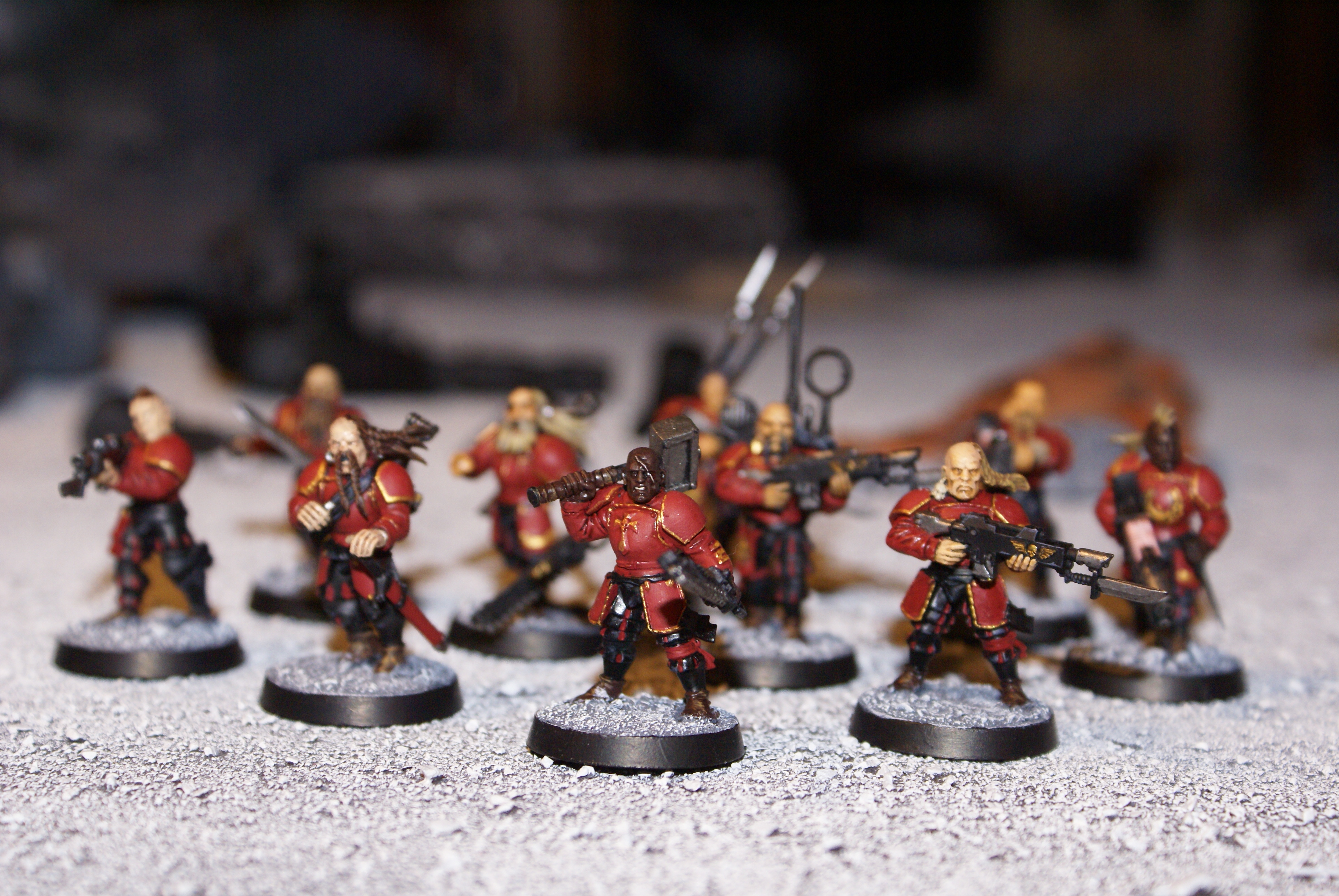 The hats are from the bretonnian men at arms, and I agree, they do look a little Japanese. I think the red helps that. Here is my work so far on the first squad. I like the colors so far. Automatically Appended Next Post: Also subtle conversion work on the squad leader modeling him with a pointing power sword. Just a hand and weapon swap.