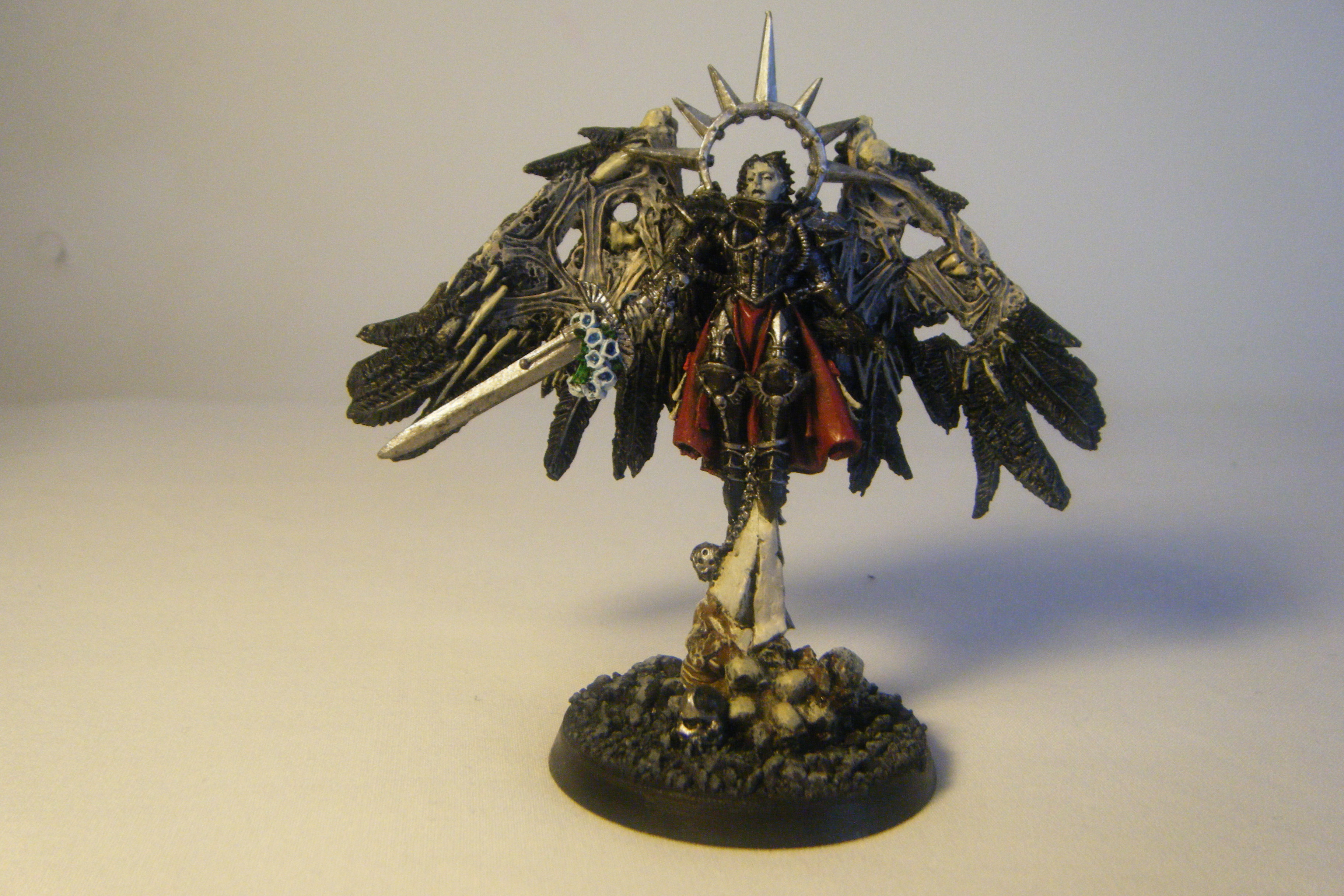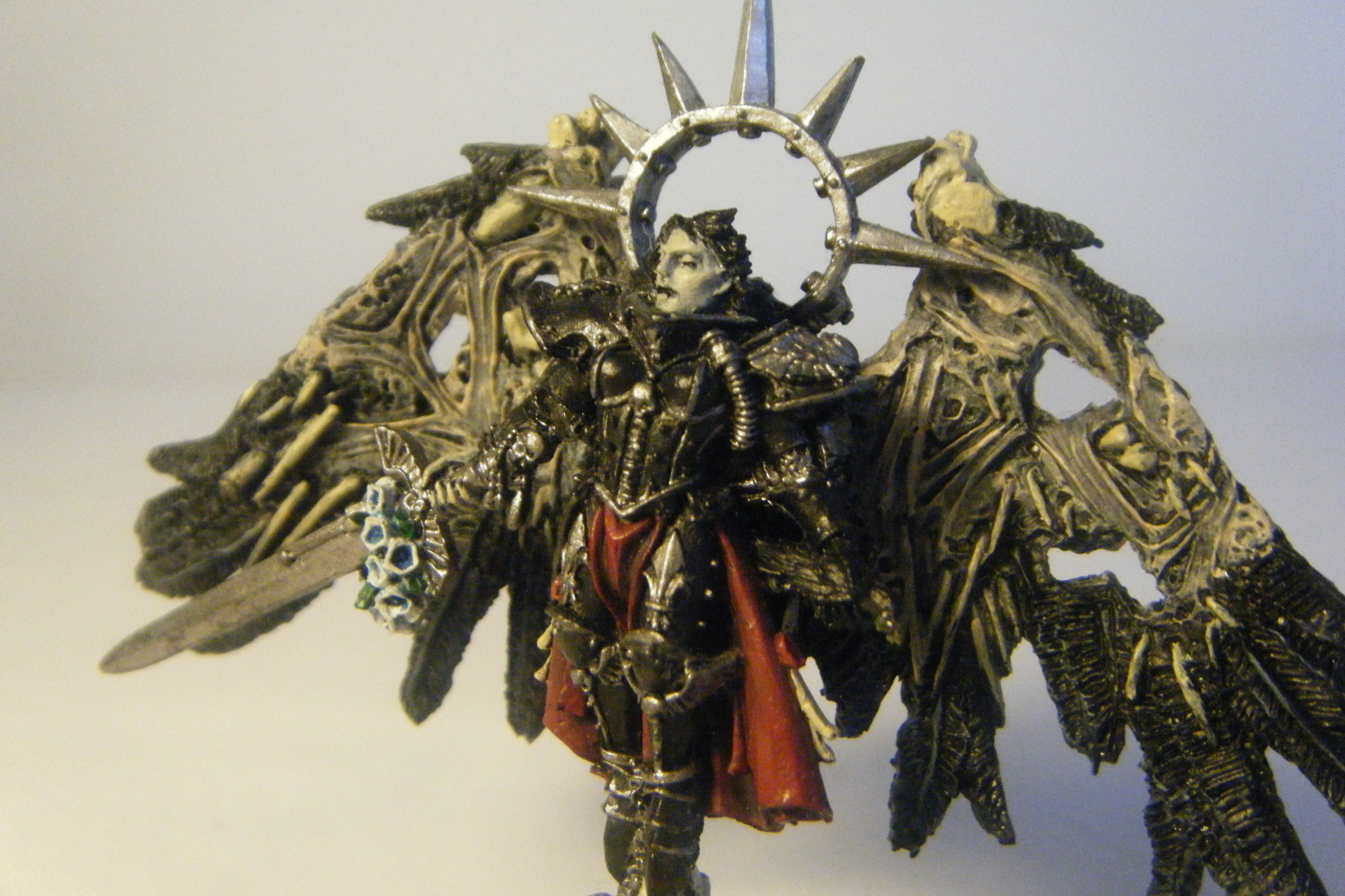 @spooner6 , I found it interesting in the fluff for celestine she came back as this flying saint thingy and then was killed again. So I figured I would model her second incarnation as an undead angel with rotten flesh and blackened armour, plus it pissed off my flatemate who like it more than his gold and white angelic celestine , haha