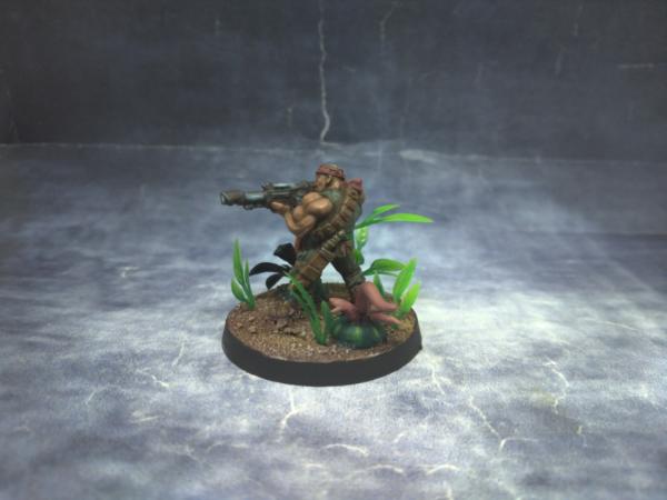 While searching online to try to figure out when this model was released (1988), I came across an example of this guy painted in Flesh Tearers colors, in which the painted remarked on the model's resemblance to "Snake" Plissken. I decided to go in that direction with his colors.