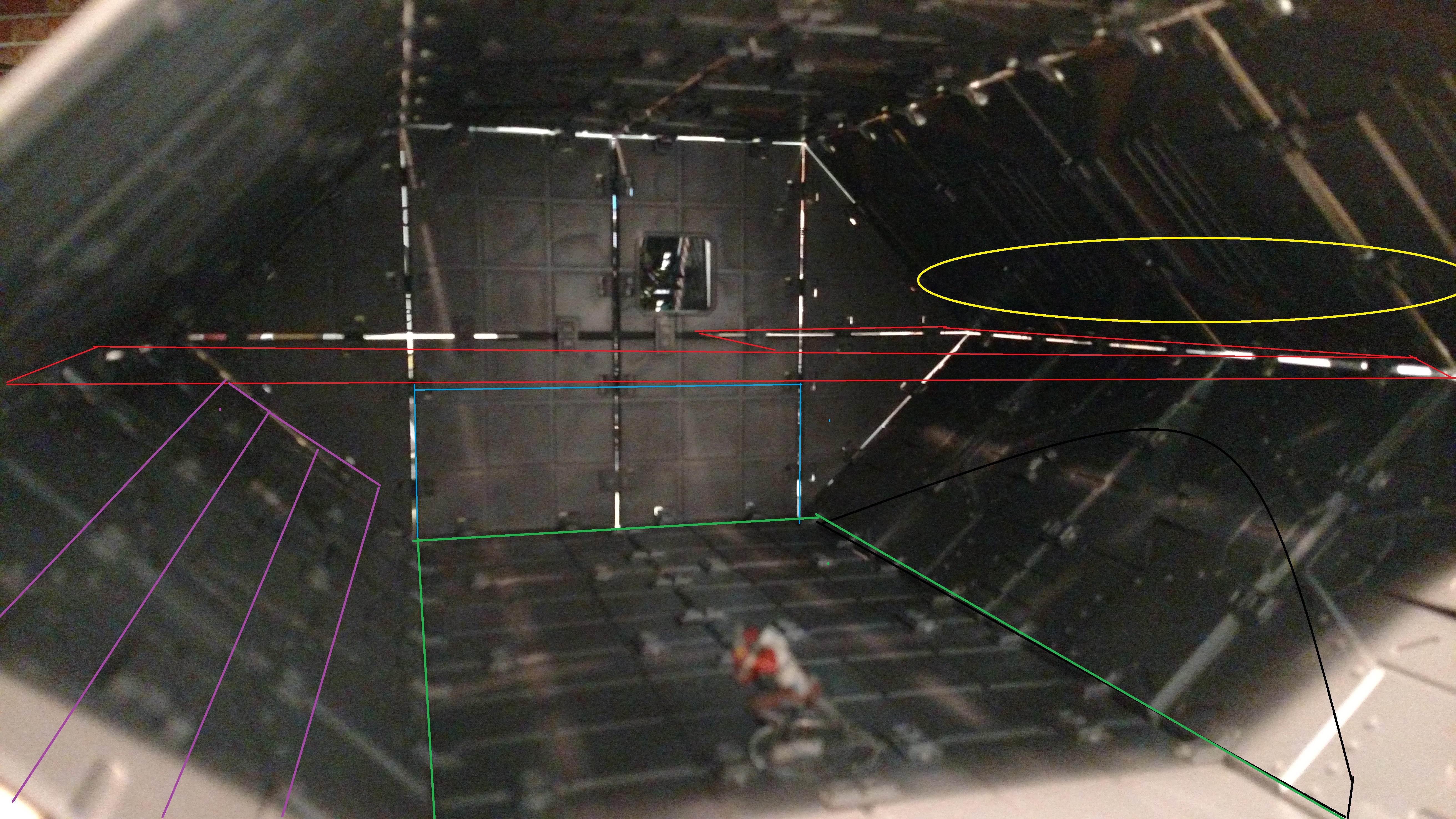 The red area being a walkway/floor, with railing, the yellow circle part being an area set aside for seats like in a C-130. The blue square being an area for a rear ramp door, like on the Epic 40k lander. Then your purple area could be flat horizontal tiers added to the wall, on which items are stored. Green is the floor for your tanks, the black area is an apt place for computers, screens, repair tools, etc.