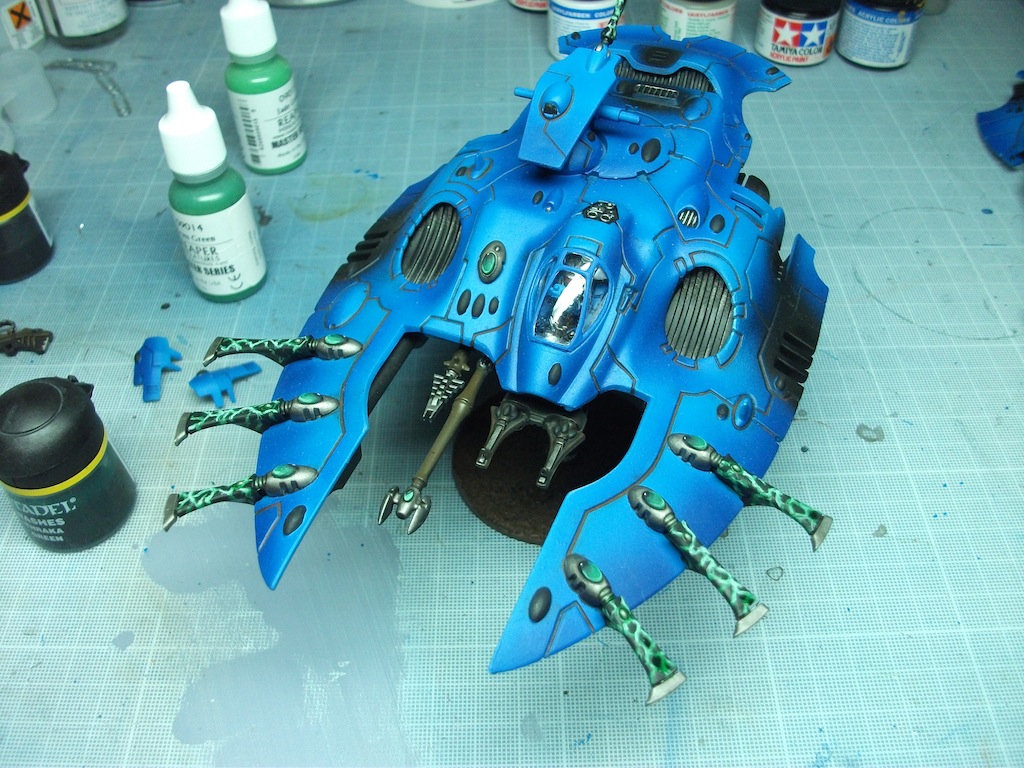 Saved a lot of time yet again. Its time to do the blue next so I'll need to mask off the upper hull panels individually and mask bits of the weapons and Wraithlords. Should be good though. looking forward to it and the paints mixed and ready for the mid tones/ basecoat.